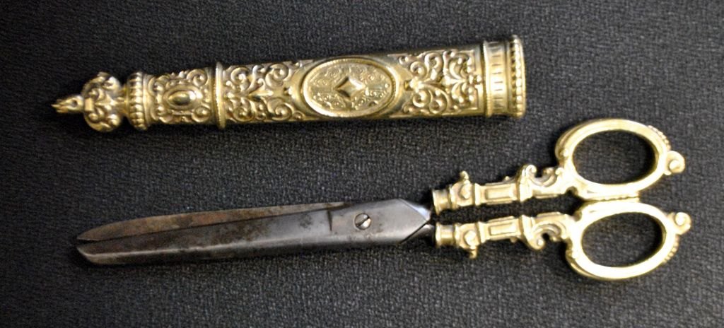 Messingschere in verzierter Messingscheide, 1880. L. 26,5 cm.Bestellnummer: 28571