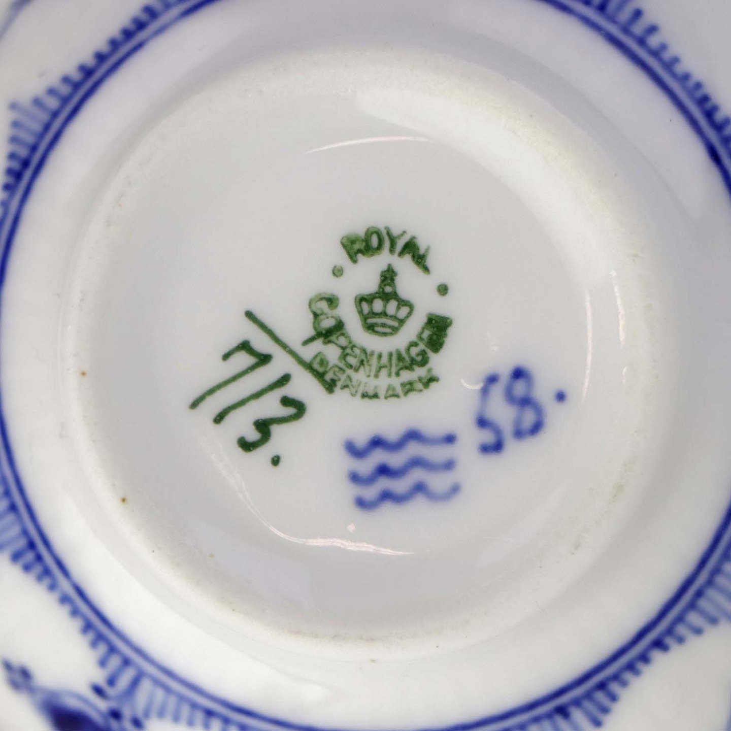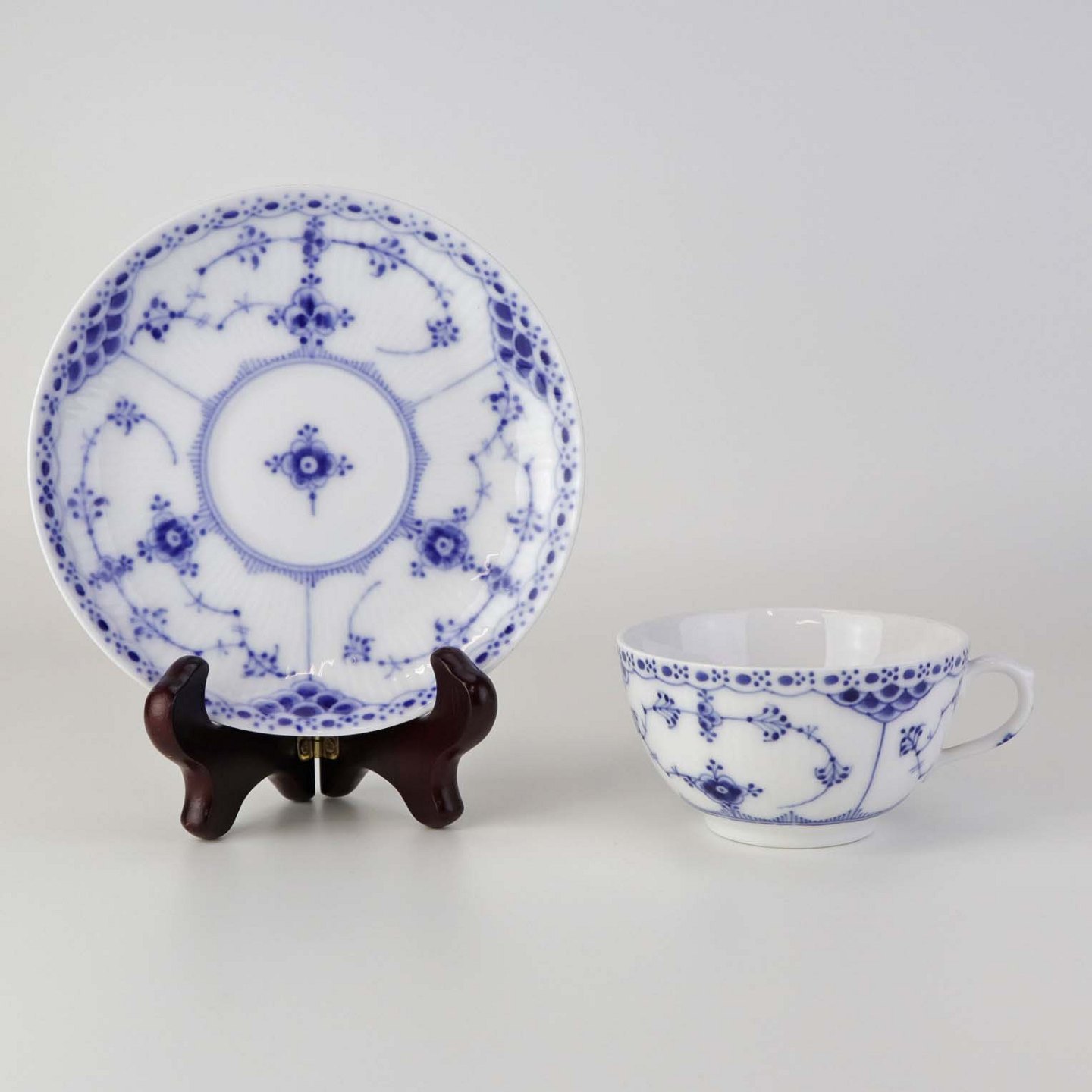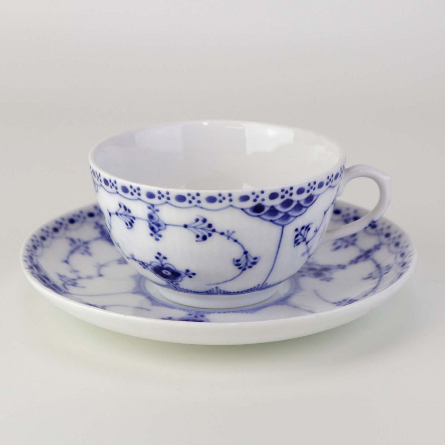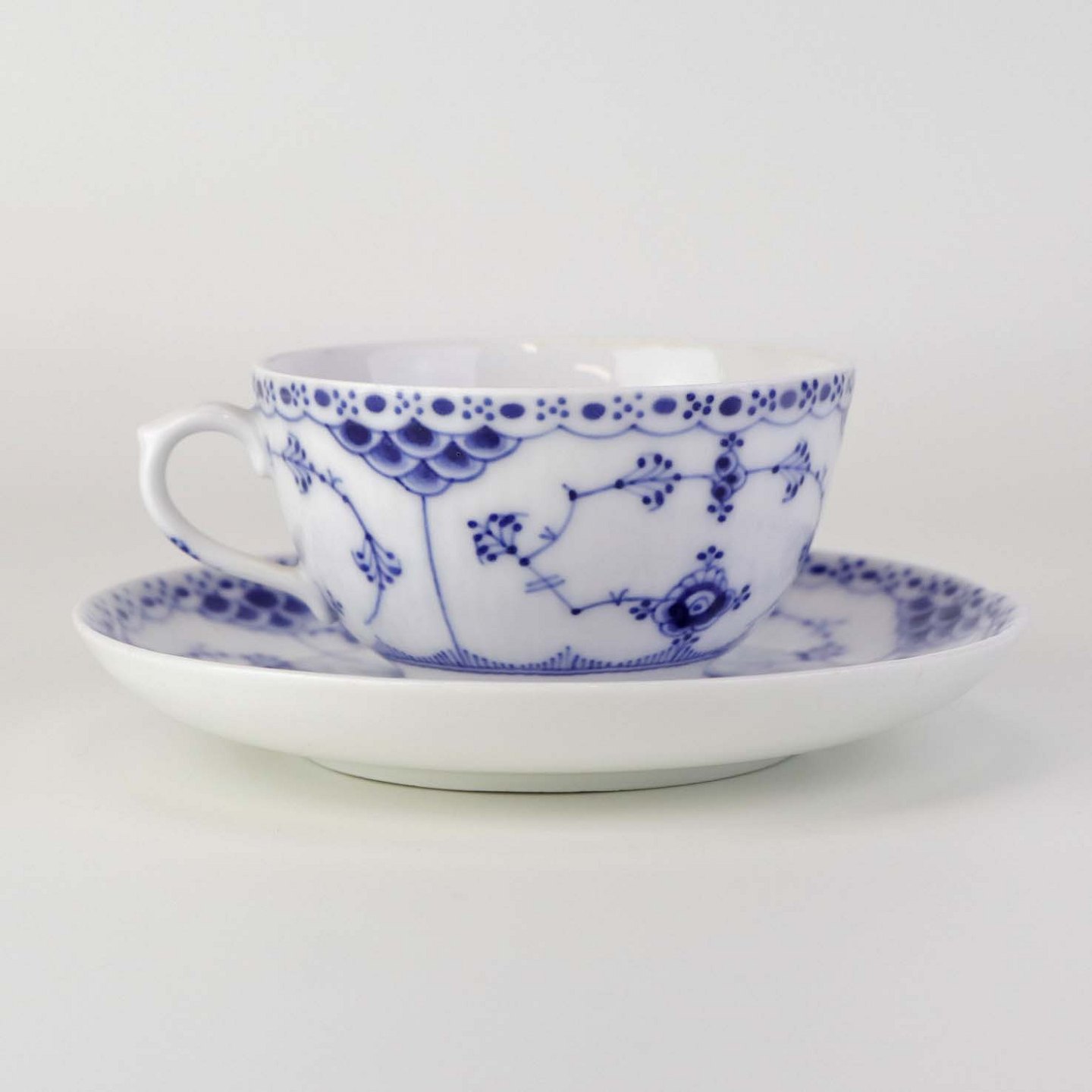 Mellemstor tekop med underkop i kongeligt porcelæn fra stellet Musselmalet Halvblonde. Nr. 1/713Design Arnold Krog