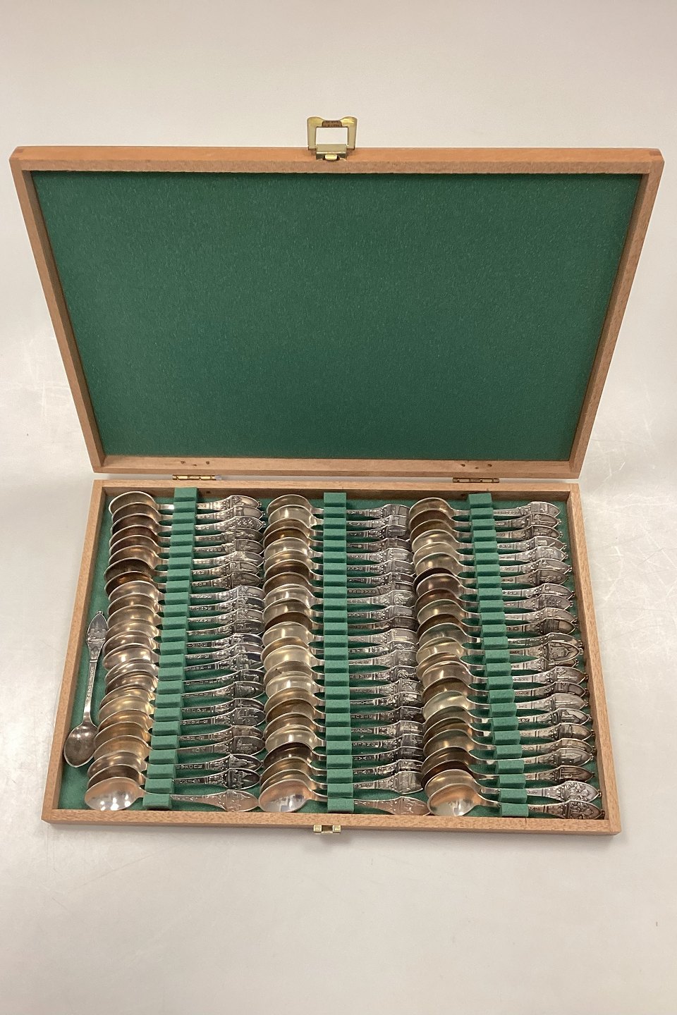 Stor Samling af Byskeer i Sølvplet214 styk blandede skeer fra forskellige byer, samlet i 3 samlekasser i træ.