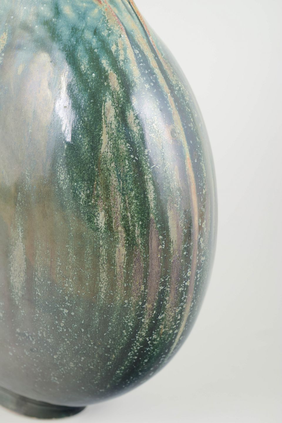 Stor, skulpturel vase i stentøj med markant organisk form og en dobbeltåbning, der giver værket en nærmest biomorf karakter. Glasuren er udført i dybe grønne, turkise og jordagtige toner med subtile løbere og variationer.