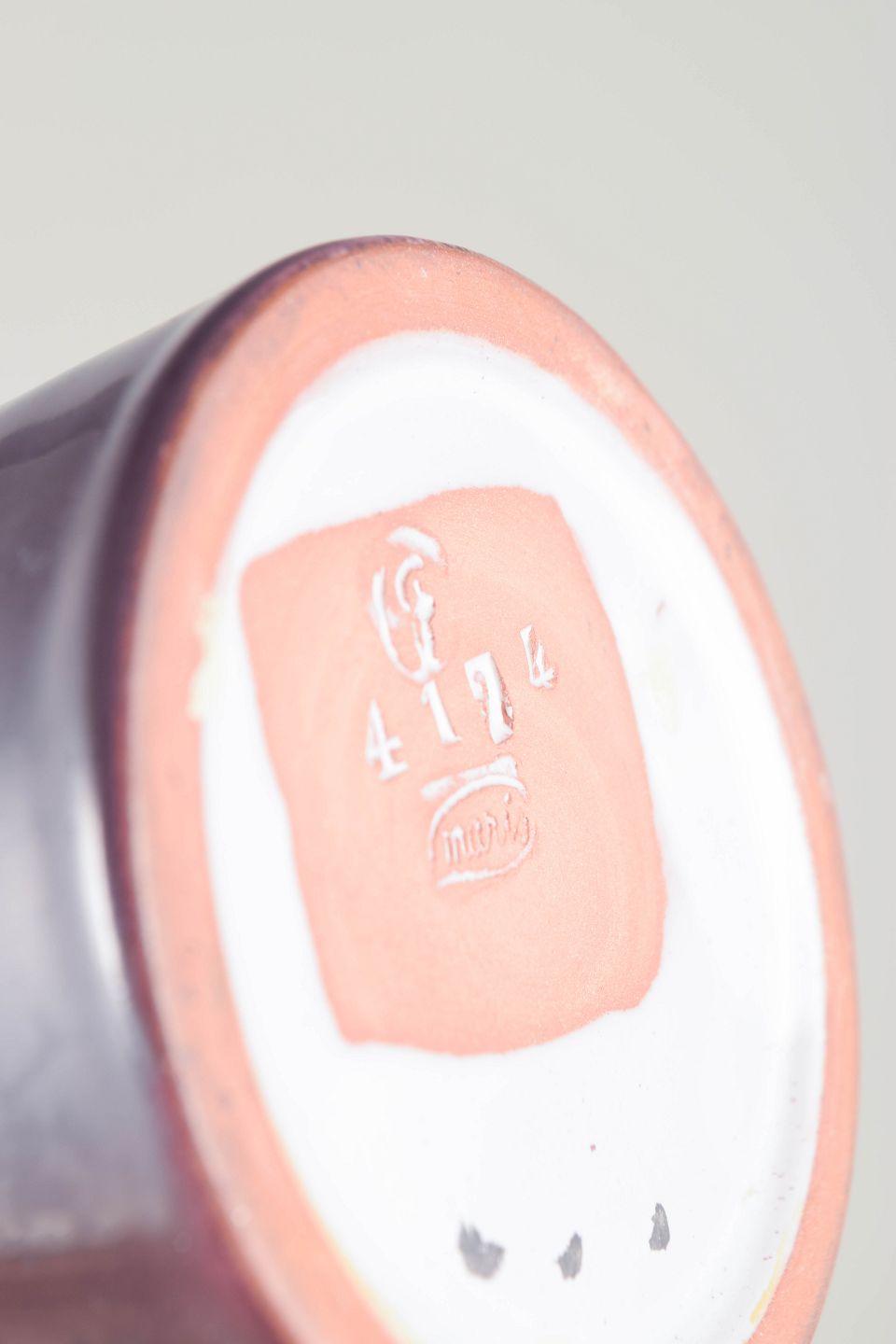 Skulpturel konisk vase i dyb lilla glasur med riflet skålformet åbning i kontrasterende lyse toner. Et markant, dekorativt 1960’er-design med Simmulsons karakteristiske formsprog.