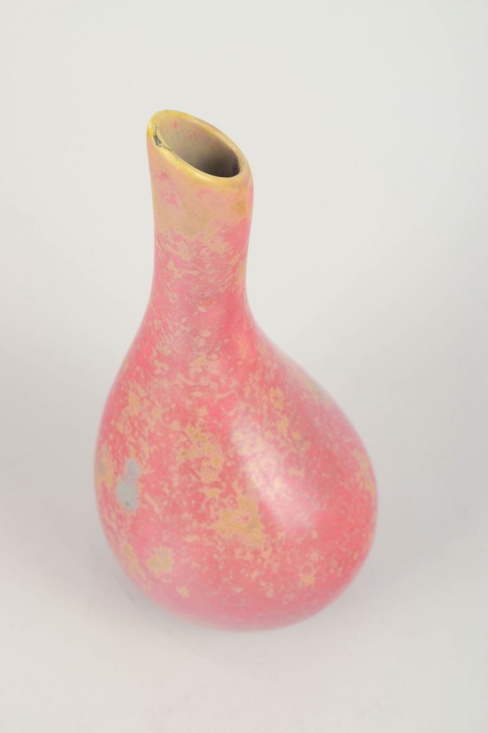 Elegant dråbeformet vase i keramik med en karakteristisk rosa og gulmarmoreret glasur. Den slanke hals og det bløde volumen giver formen et skulpturelt udtryk.