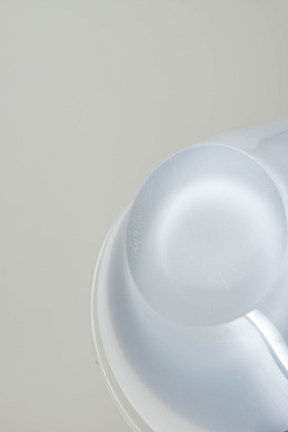 “Coquille”-skål i flerlaget kunstglas med dyb grå/sort indfarvning og hvidt mellemlag, omsluttet af klart yderglas. Den asymmetriske, opadbuede form er karakteristisk for Kedelvs organiske mid-century design.