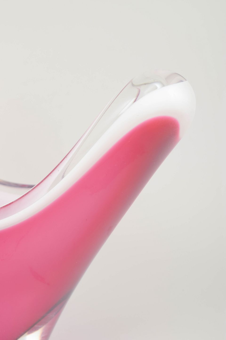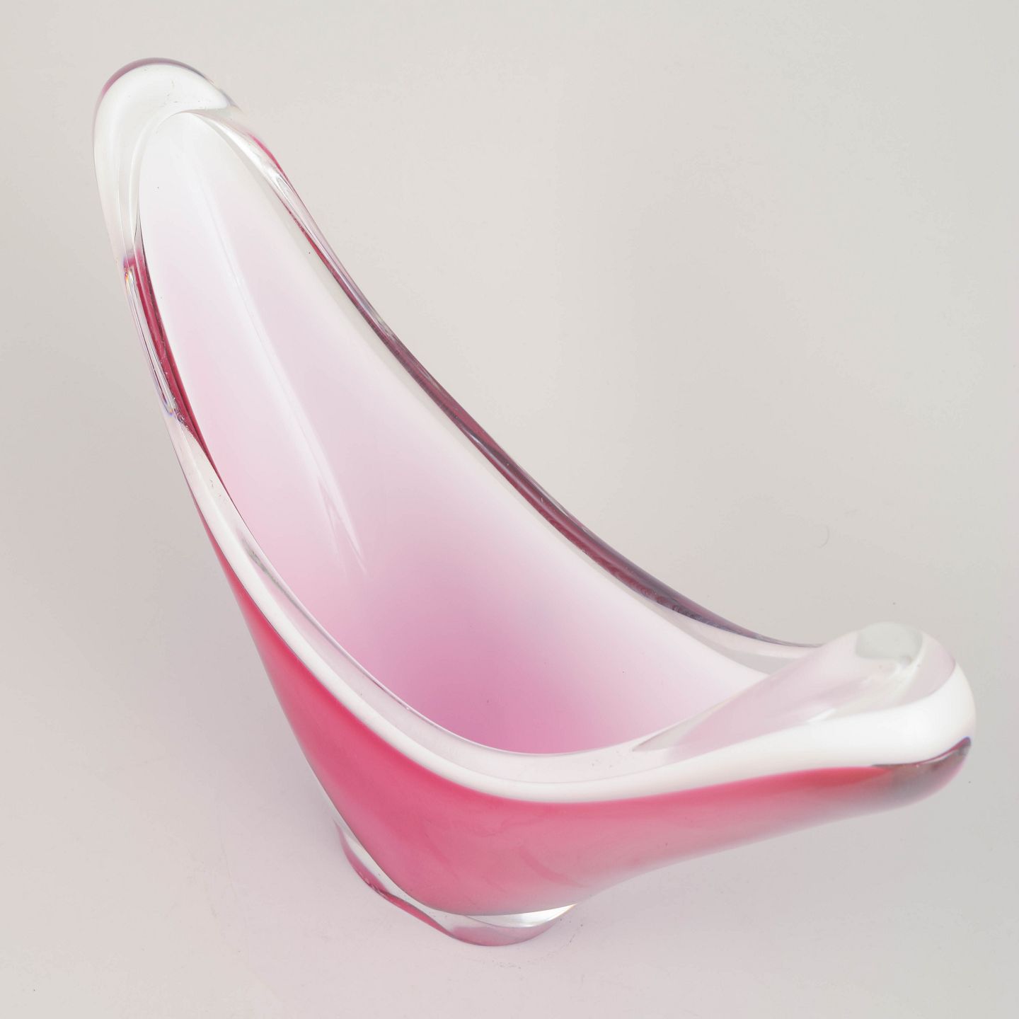 Imponerende “Coquille”-skål i flerlaget kunstglas med dyb rosa indfarvning og klart yderlag. Den brede, svungne V-form er karakteristisk for Kedelvs mest ikoniske arbejder fra slutningen af 1950’erne.