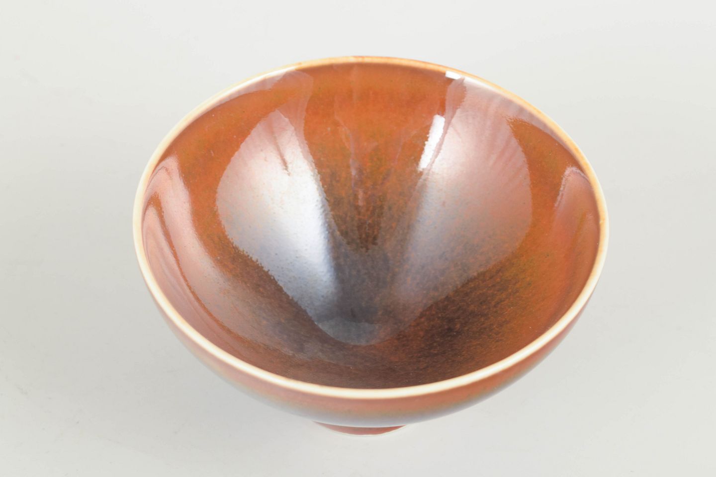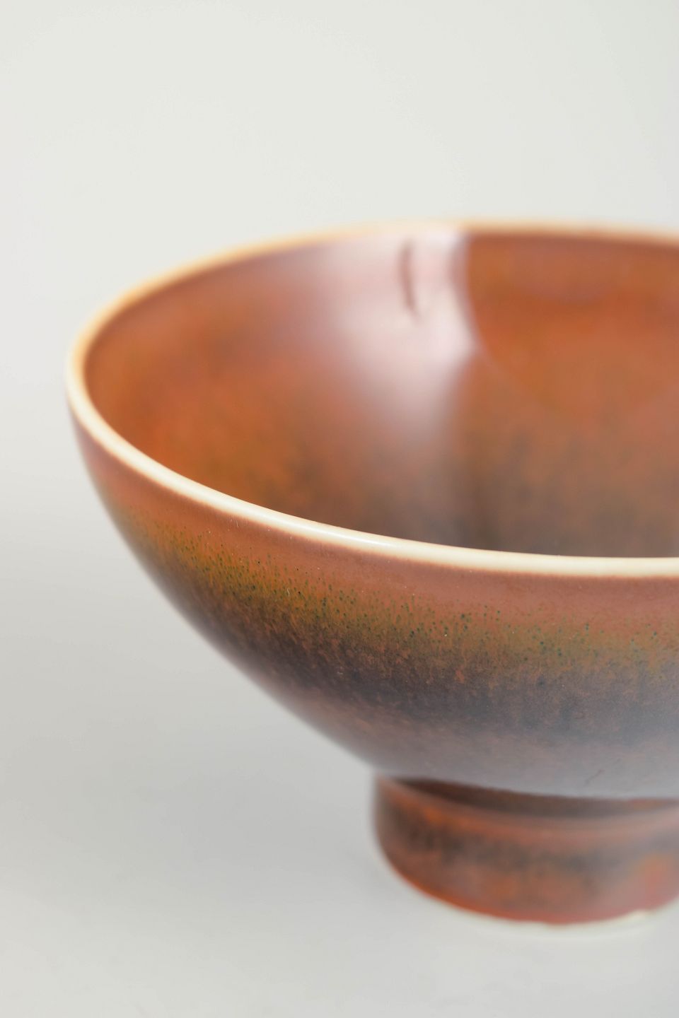 Elegant fodet skål i glaseret stentøj med varme brun-røde toner og mørkere nuancer, udført i Stålhane’s karakteristiske, raffinerede glasurarbejde.