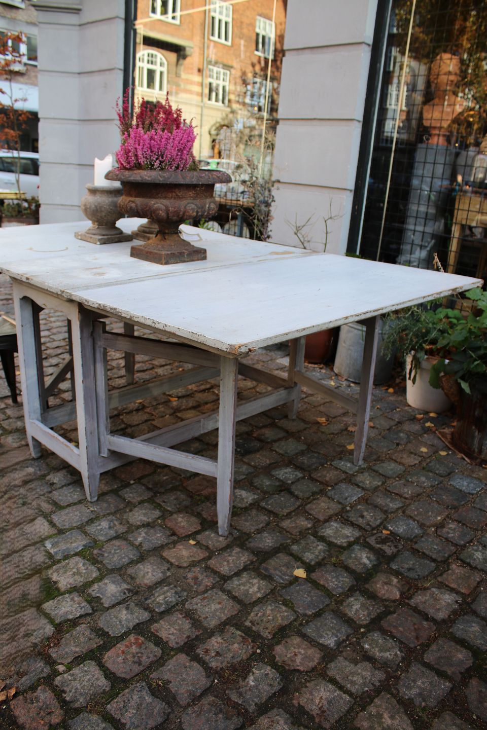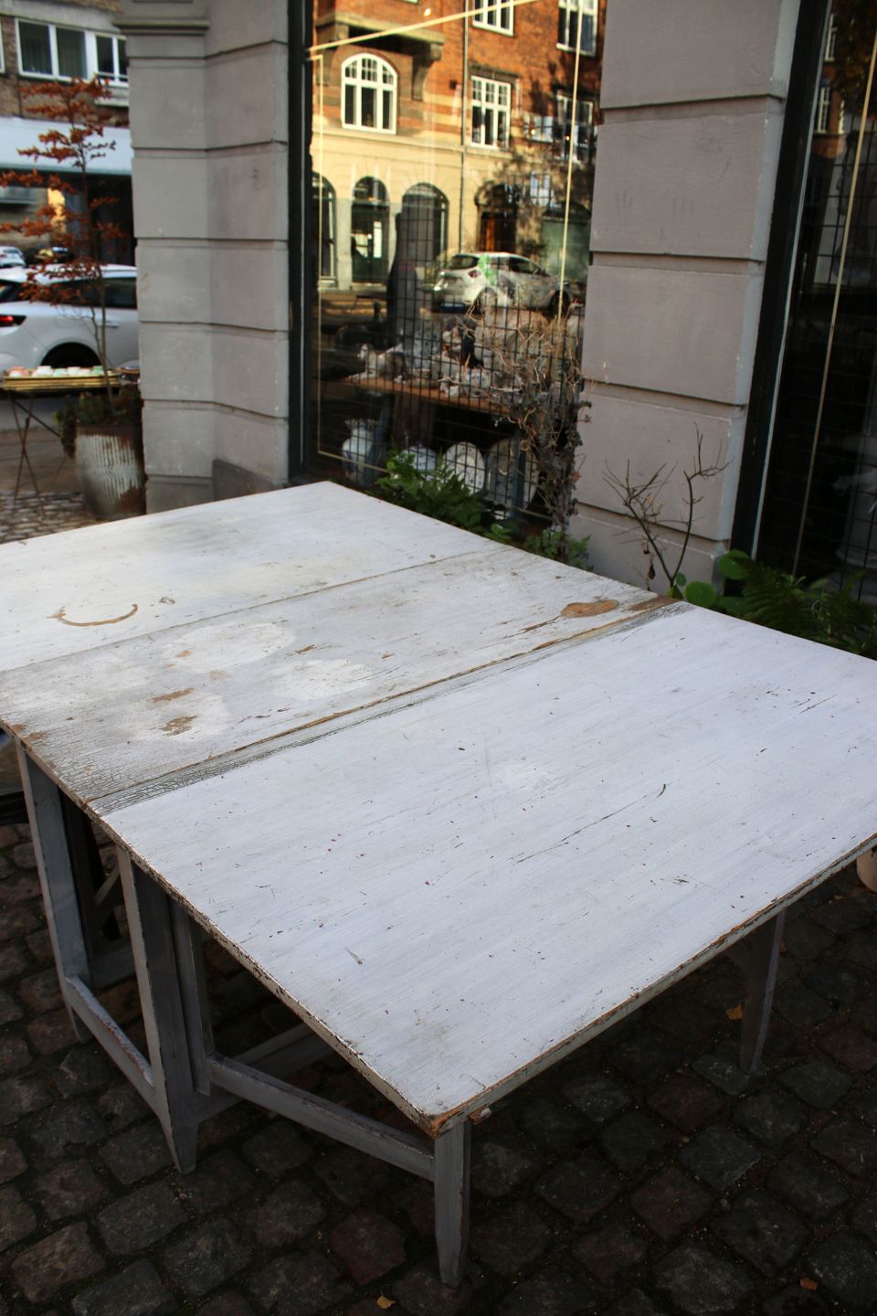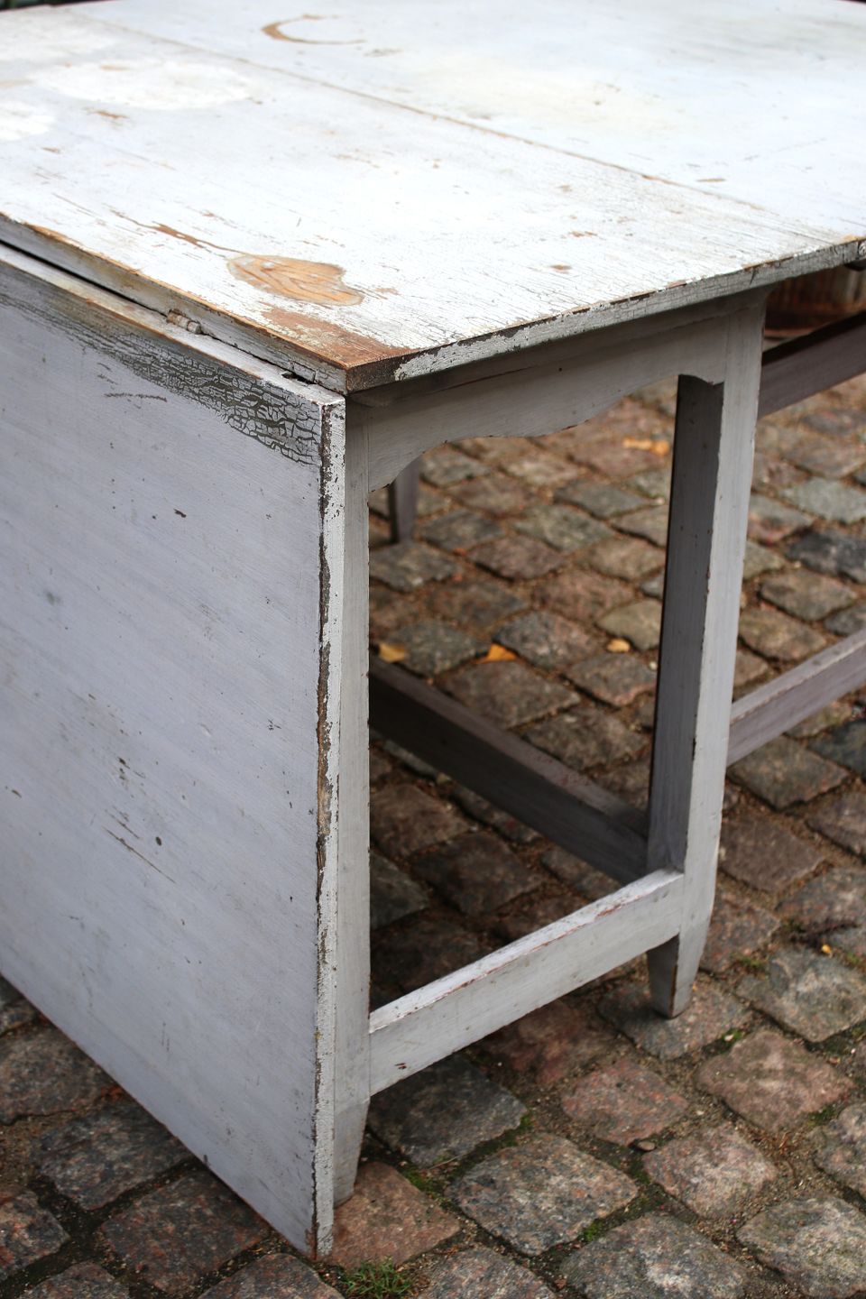 Old Swedish Gustavian 19th century folding table in a nice original gray color with a super nice patina.The table has 2 flaps and double extension legs, so it stands very stable. H: 75cm. L: 188cm. W: 119cm.