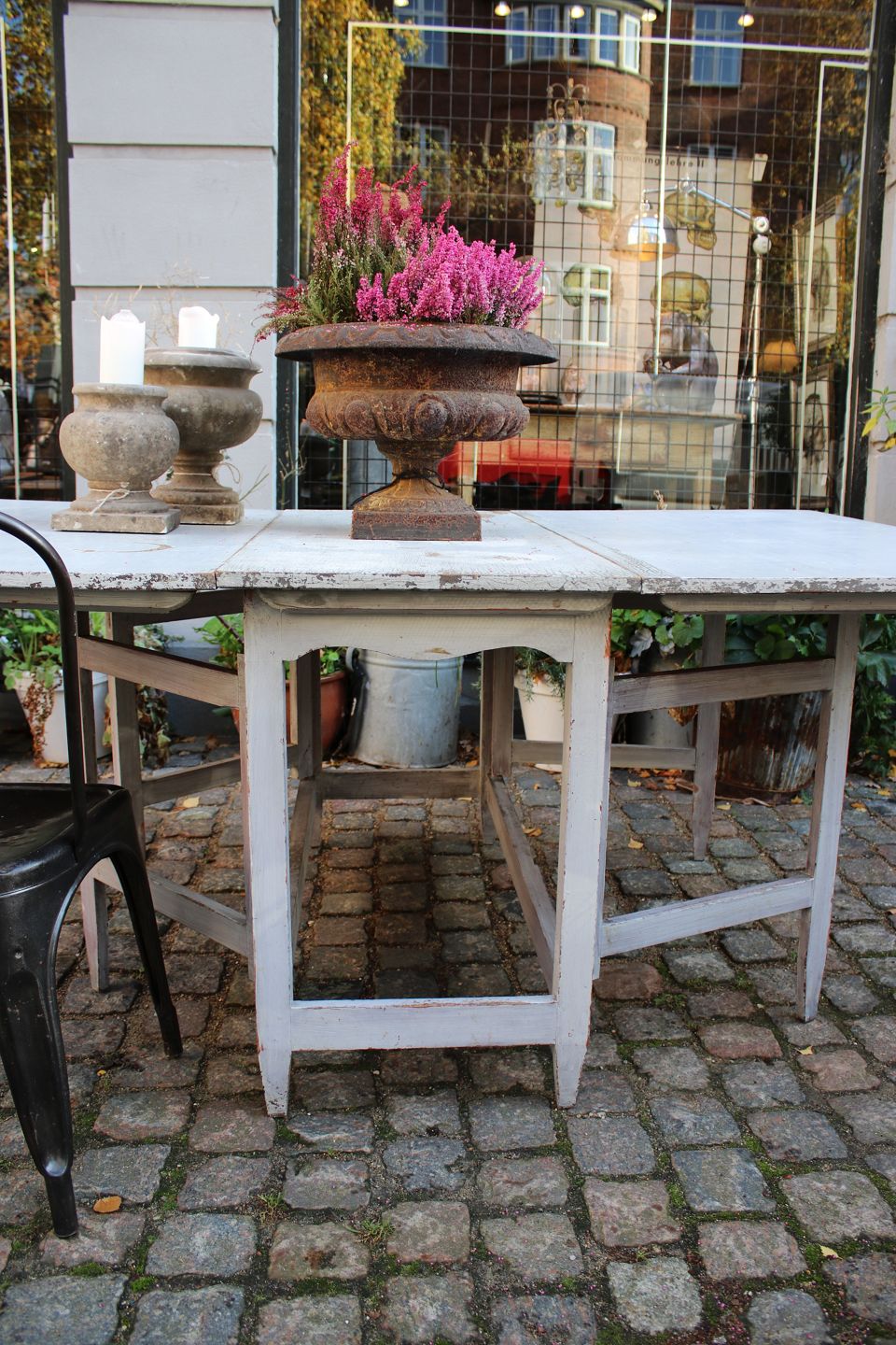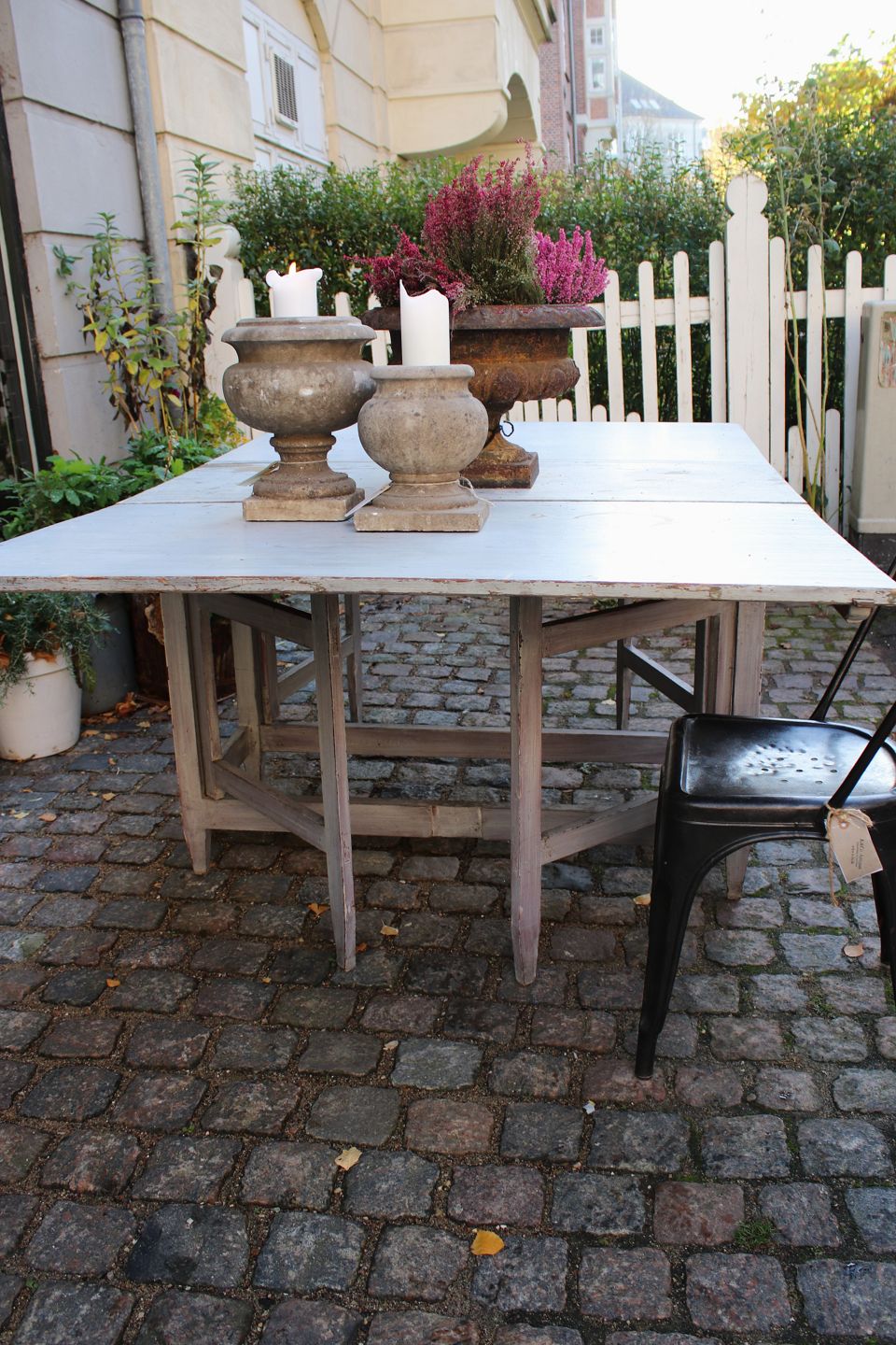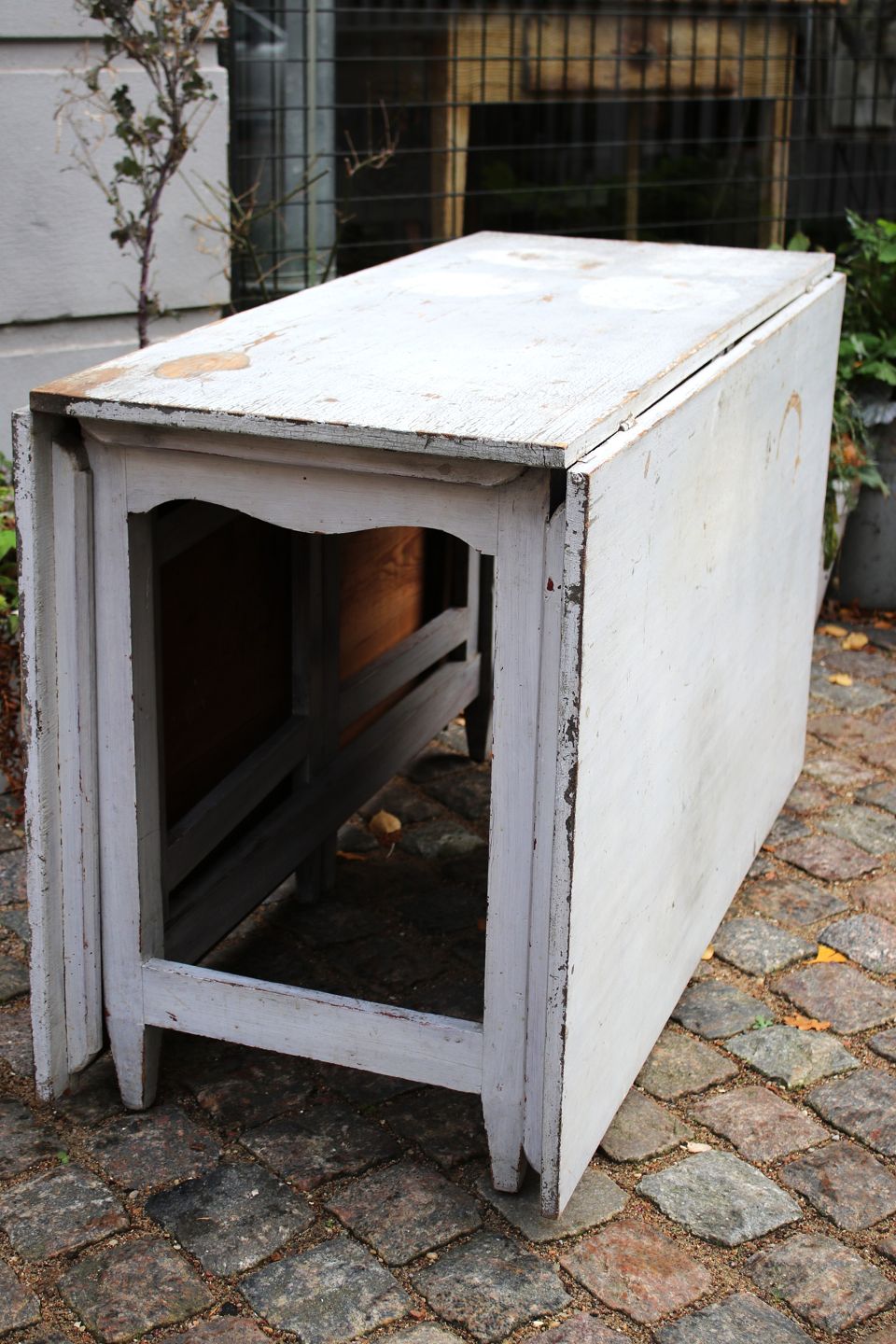 Old Swedish Gustavian 19th century folding table in a nice original gray color with a super nice patina.The table has 2 flaps and double extension legs, so it stands very stable. H: 75cm. L: 188cm. W: 119cm.