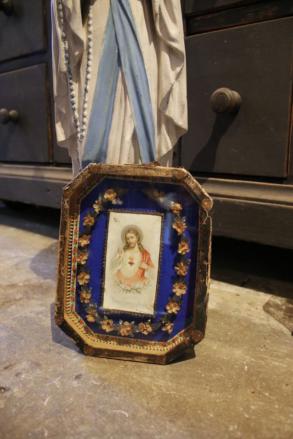 Dekorativt , gammelt religiøst billede ( med glas ) med Jesus billede og fin blomster krans i stof. Måler: 20,5 x 16,5cm. Dybde: 3cm.