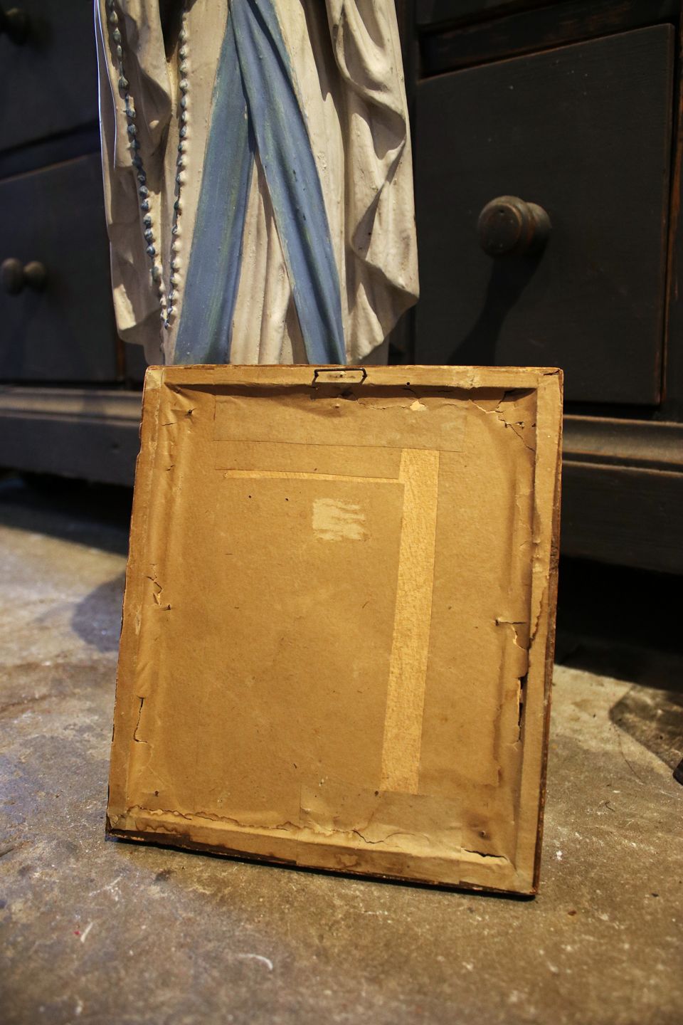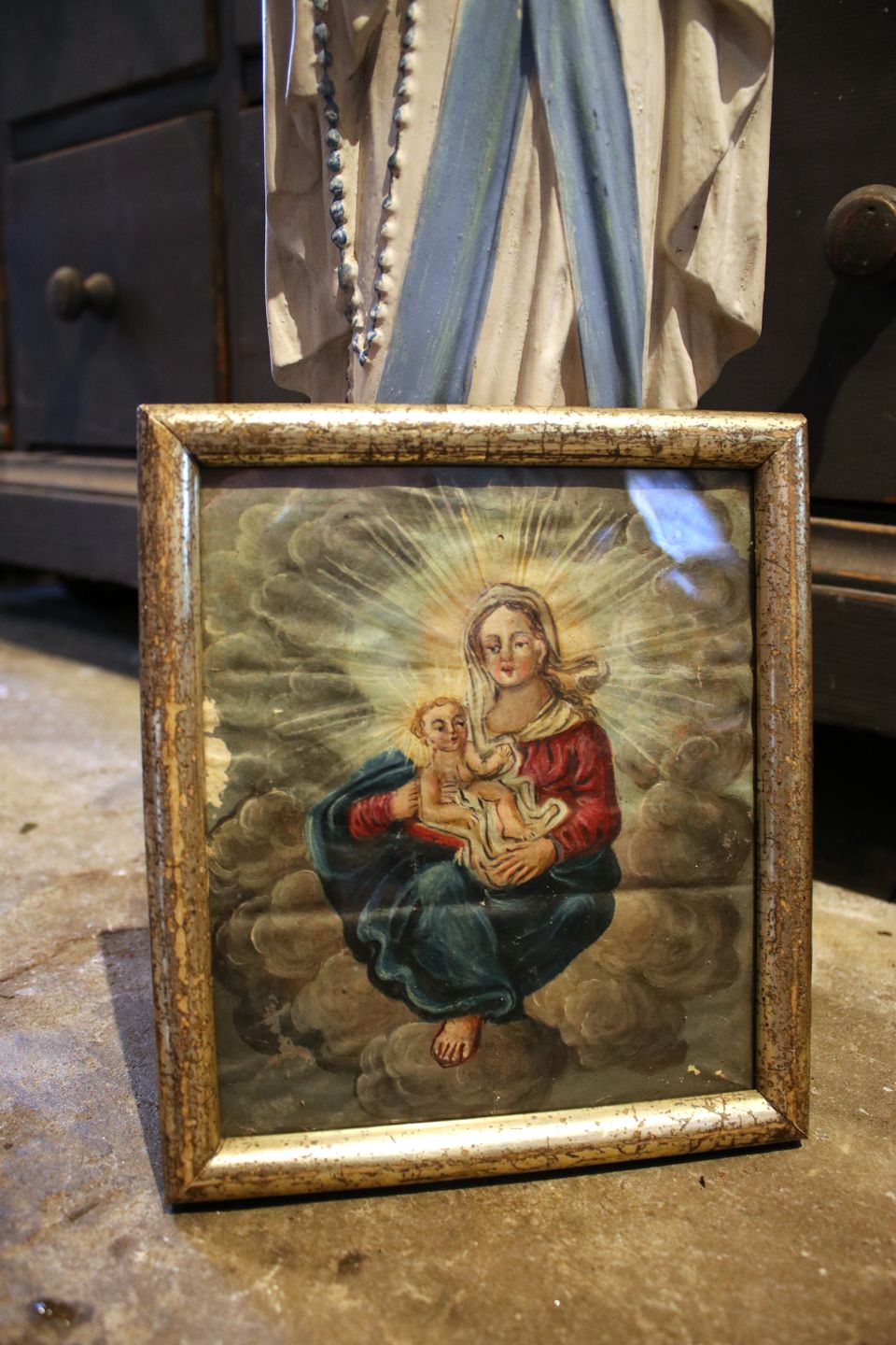 Antikt håndmalet akvarel maleri af Madonna med Jesusbarnet i gammel sølvramme...