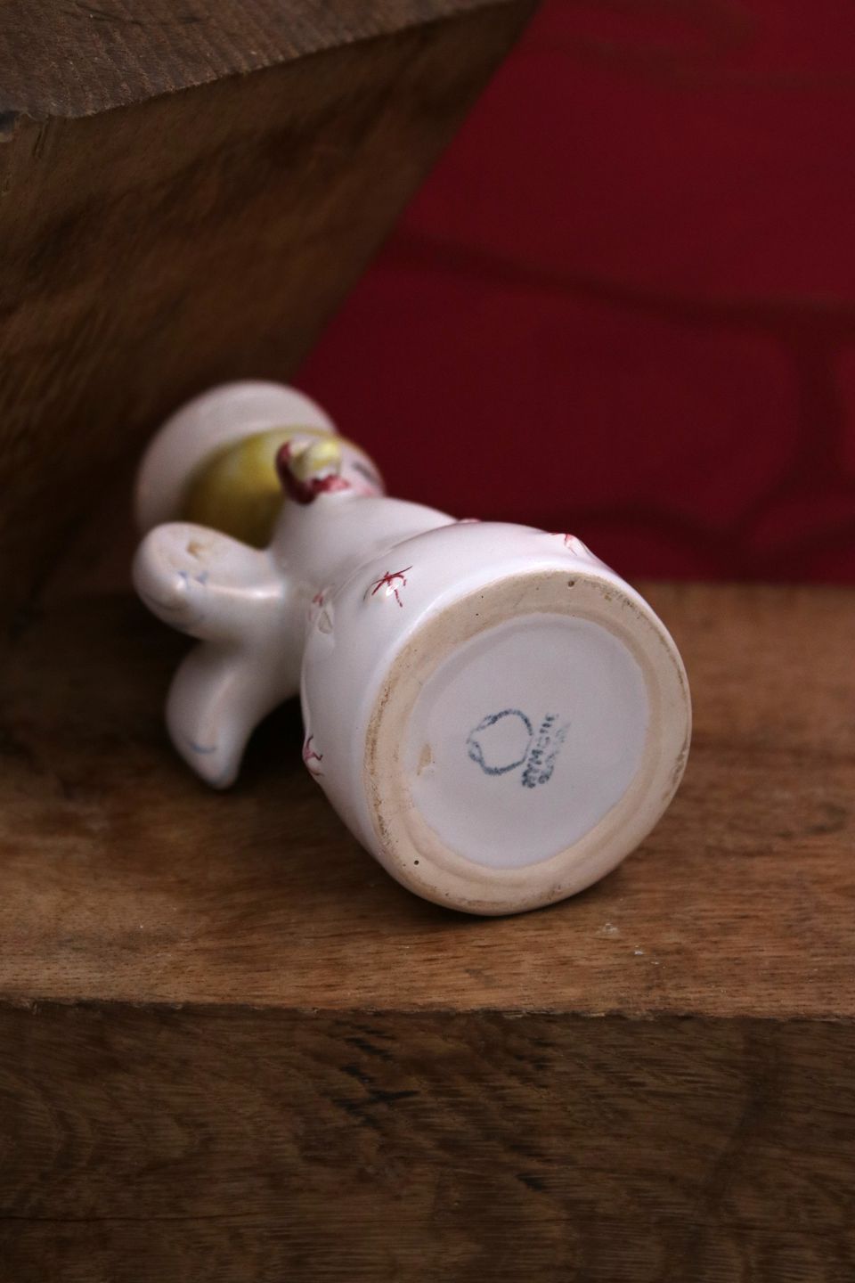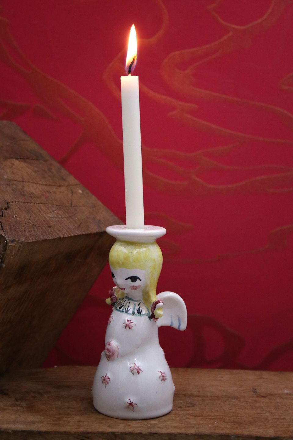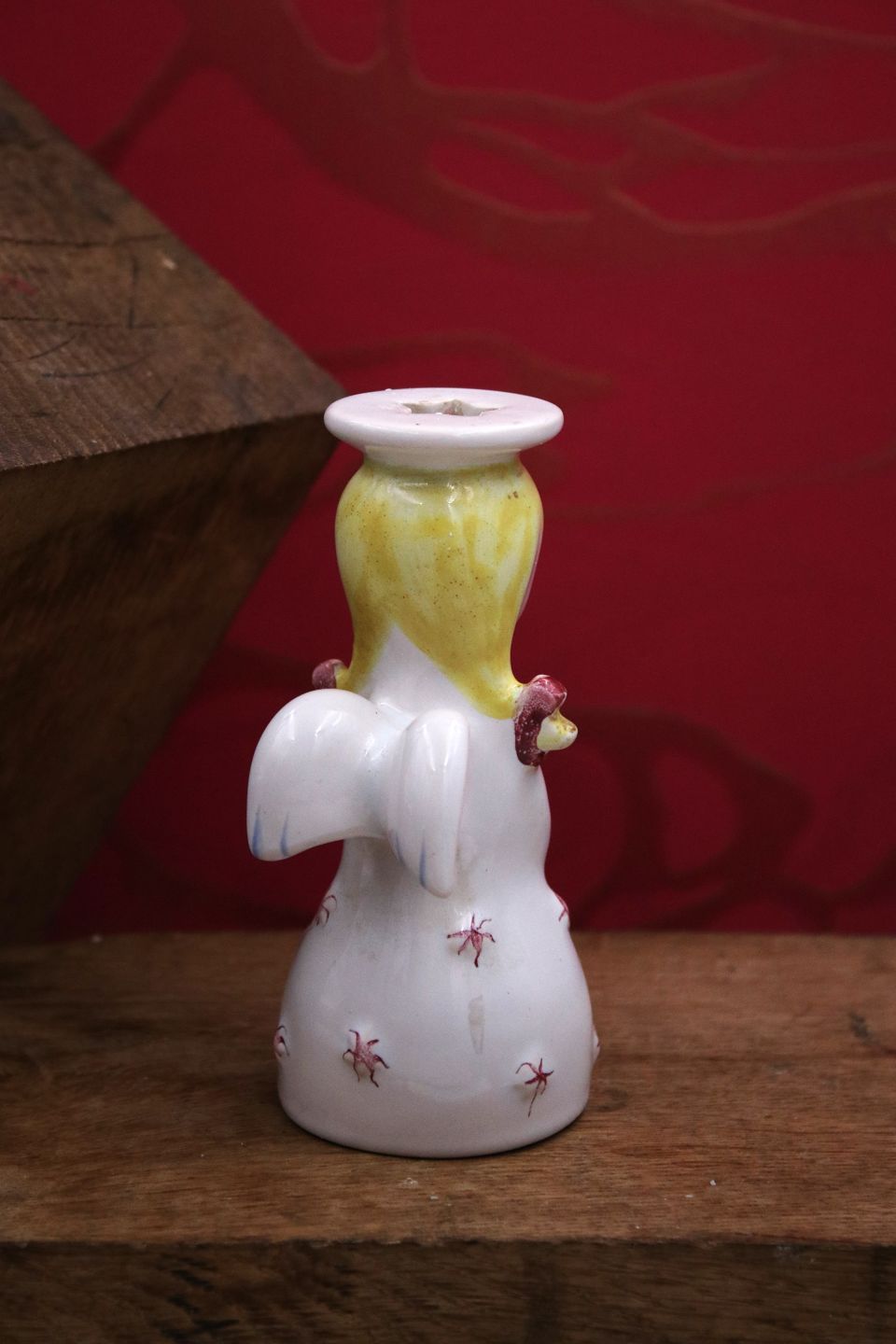 Nymølle jule engel med gult hår i fajance med plads til lille grangren eller stearinlys i toppen. H: 12cm.