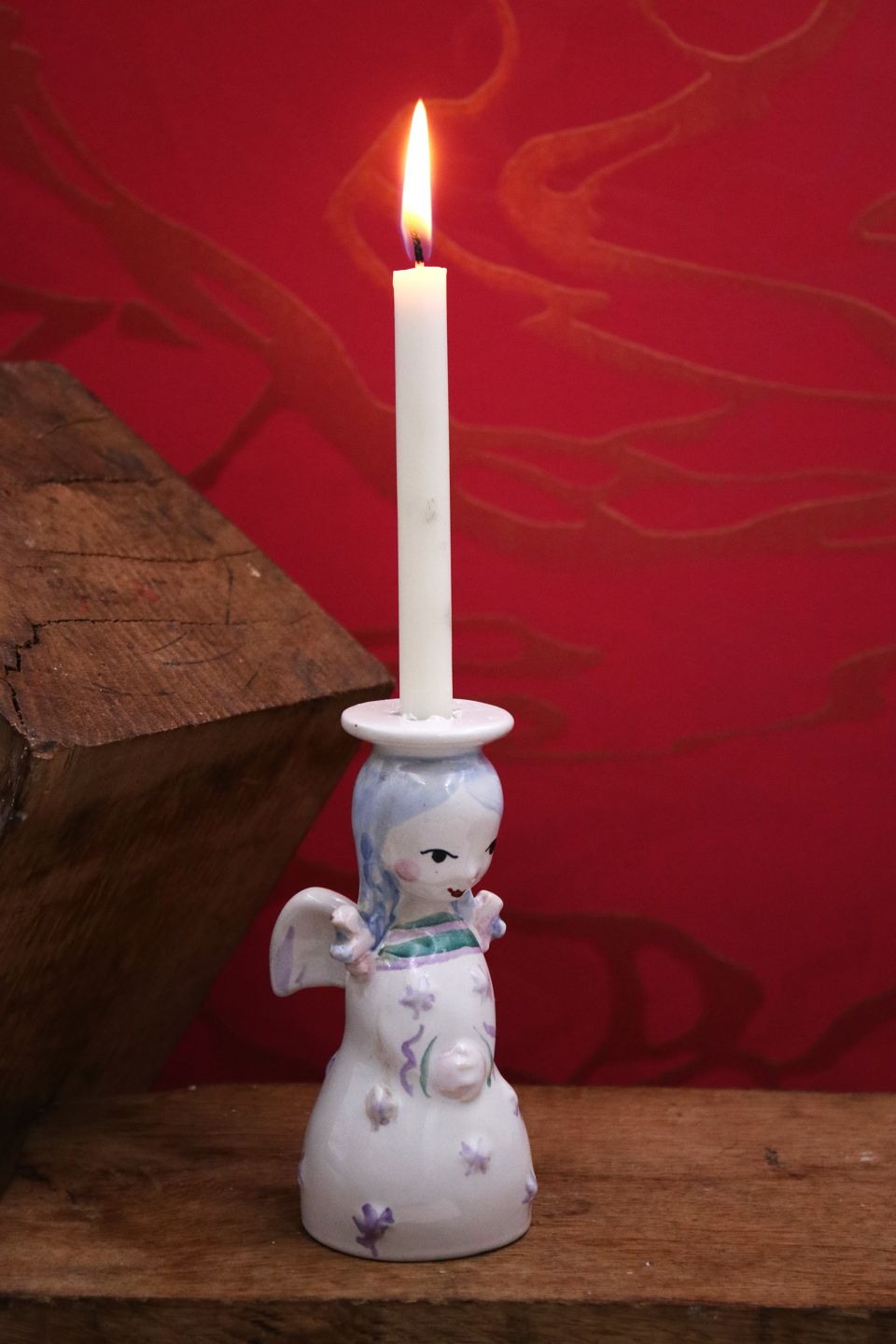 Nymølle jule engel med blåt hår i fajance med plads til lille grangren eller stearinlys i toppen. H: 12cm.