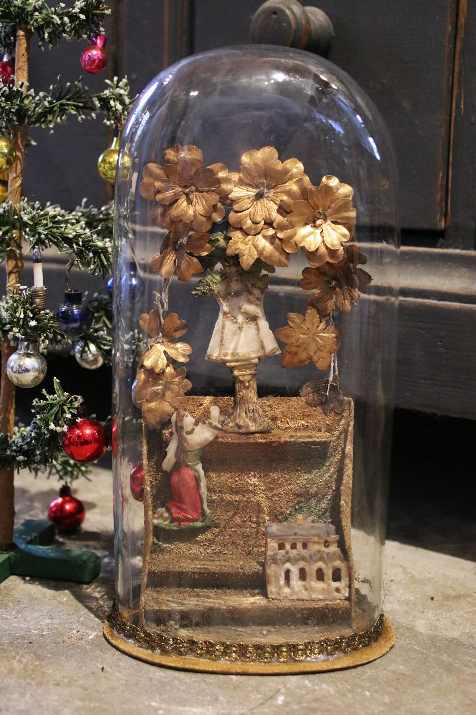 Antik , religiøs glas globe med Madonna figur og blomster dekorationer...