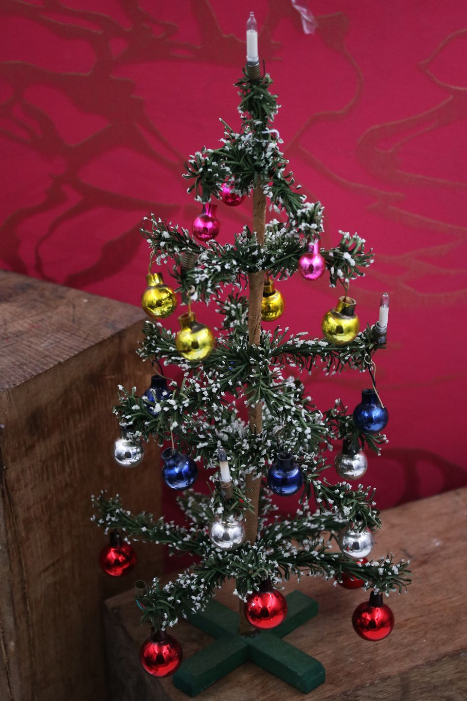 Antikt miniature juletræ , lavet i farvet papir og dekoreret med masser af små farvet jule glas kugler. Højde: 35cm.Emne nummer: Miniature juletræ