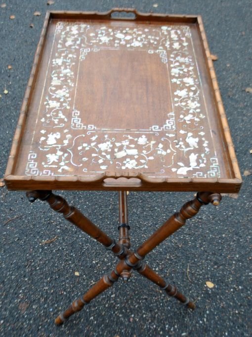 Chinesischer Tabletttisch, 19. Jahrhundert. Tablett aus edlem Holz mit Perlmuttintarsien. Mit zwei Griffen. 48 x 71 cm. Klappbarer Sockel, Höhe: 65 cm.Bestellnummer: 28577