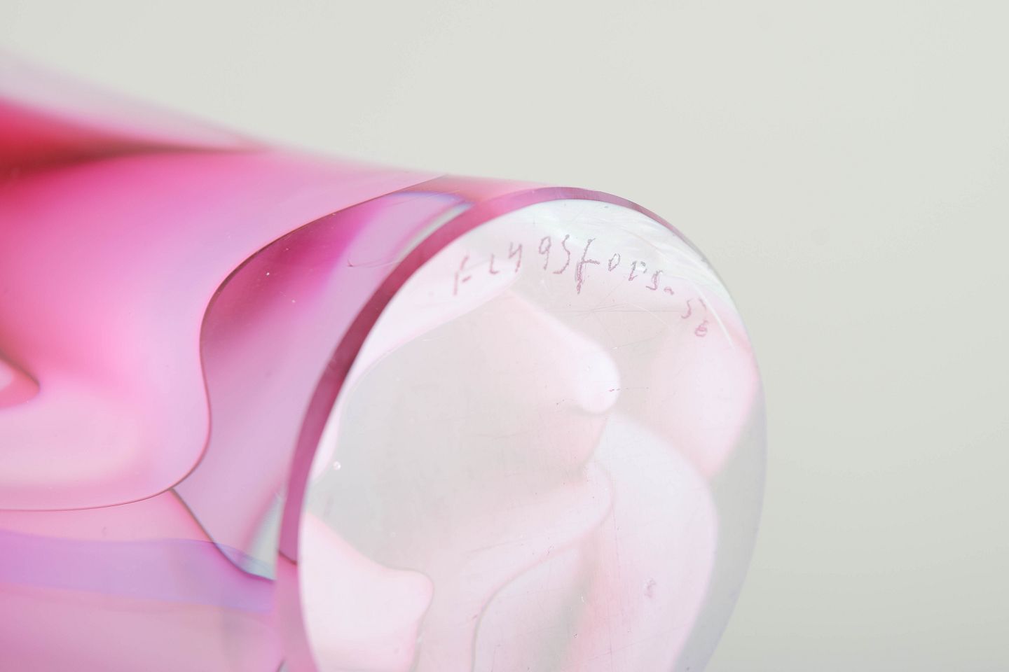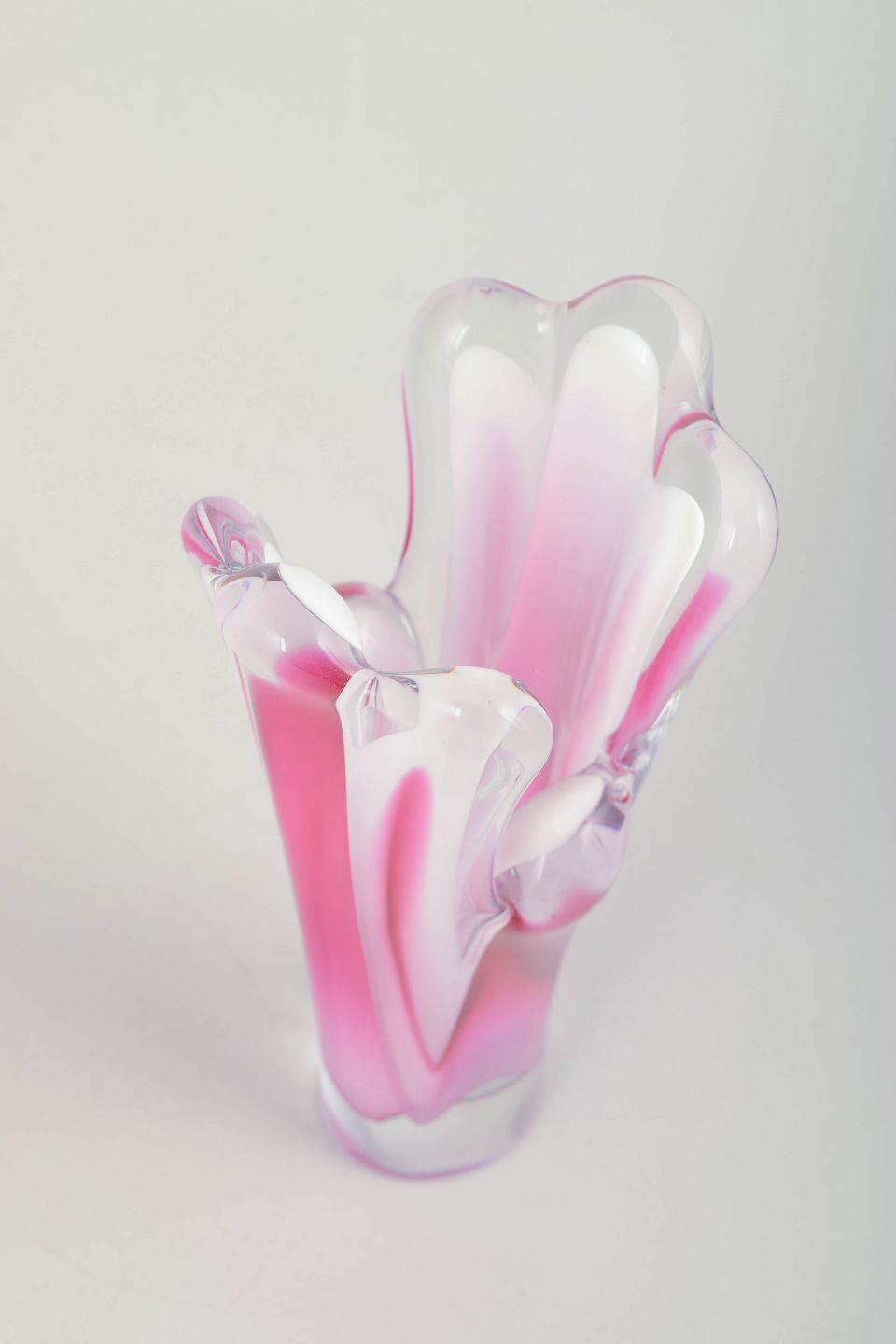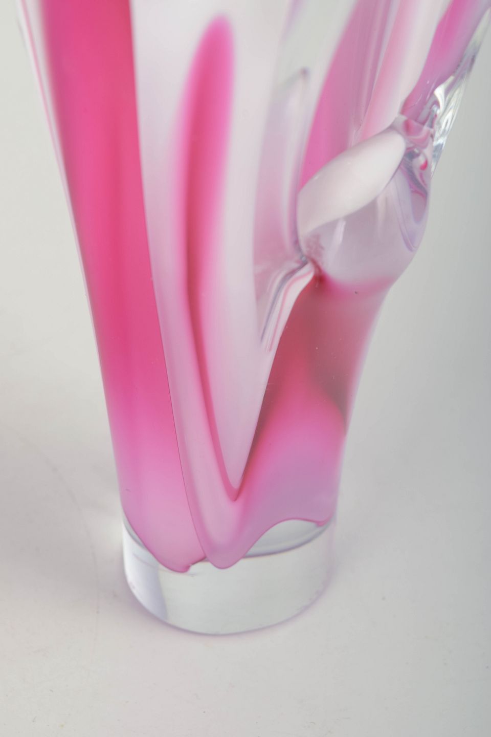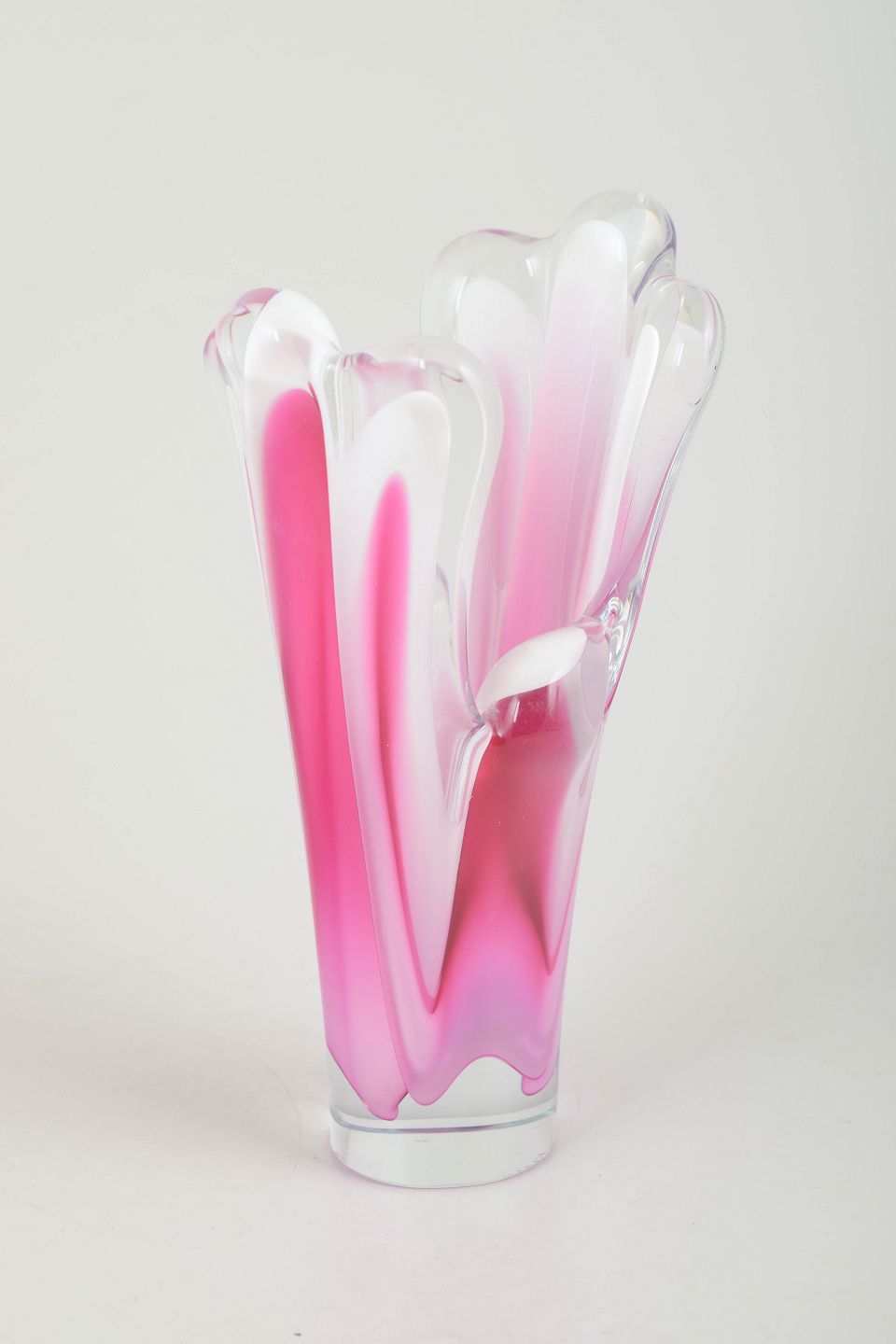 Skulpturel og organisk formet kunstglas vase i klart glas med lag i rosa og hvid. Mundblæst i en sjældnere “blomstrende” variant af Coquille-formen med flere opadstræbende blade.