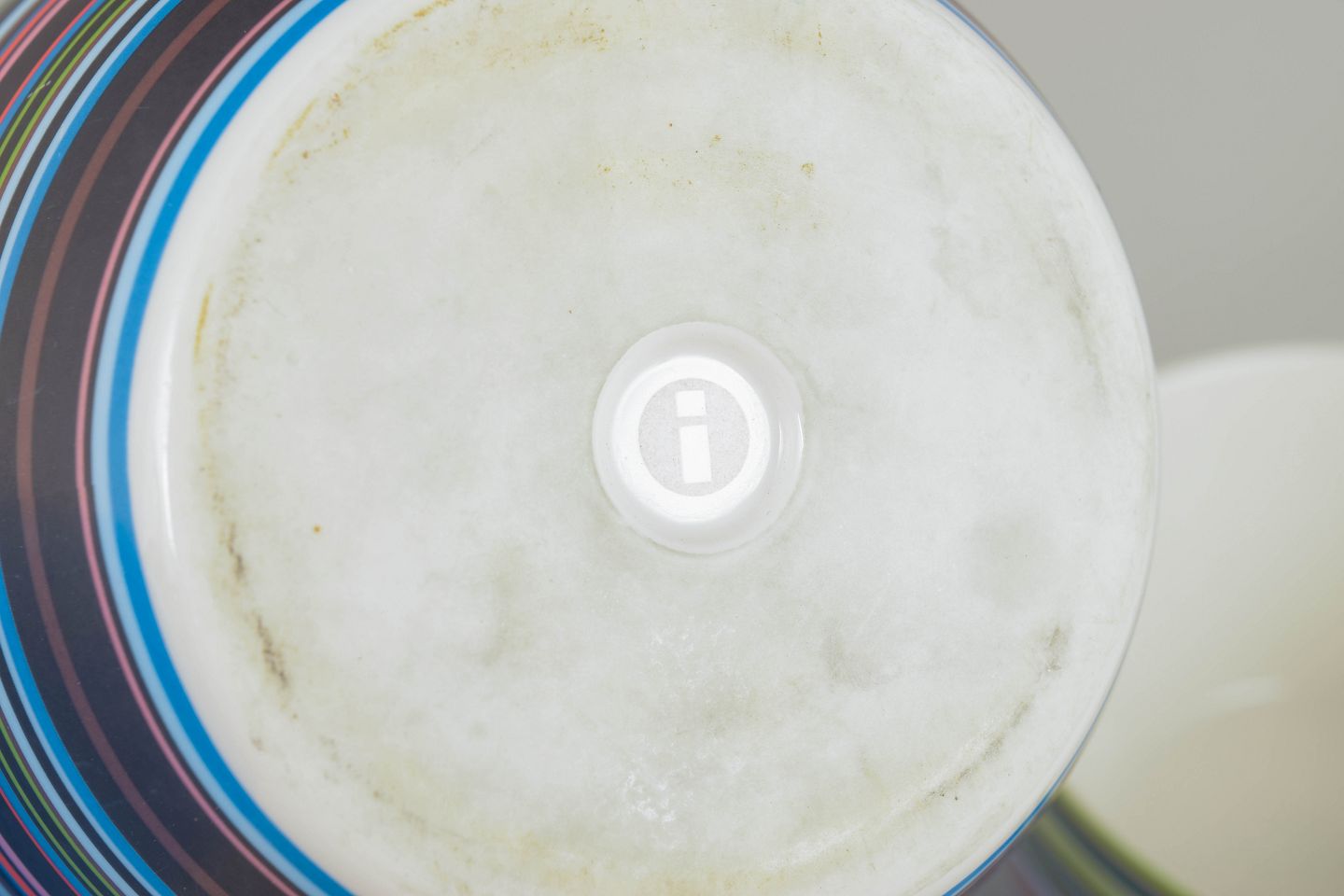 Tre farvestrålende skåle i porcelæn fra den ikoniske Origo-serie, dekoreret med de karakteristiske flerfarvede, horisontale striber. Lettere brugsspor og ridser i dekoren, jf. fotos.
