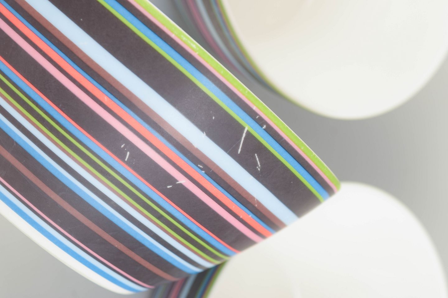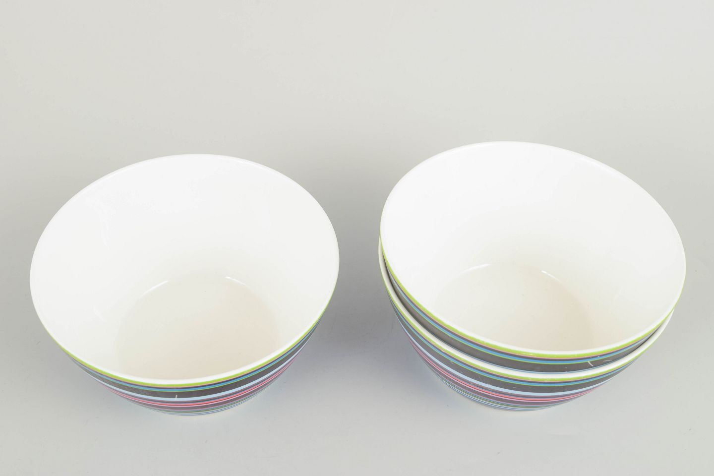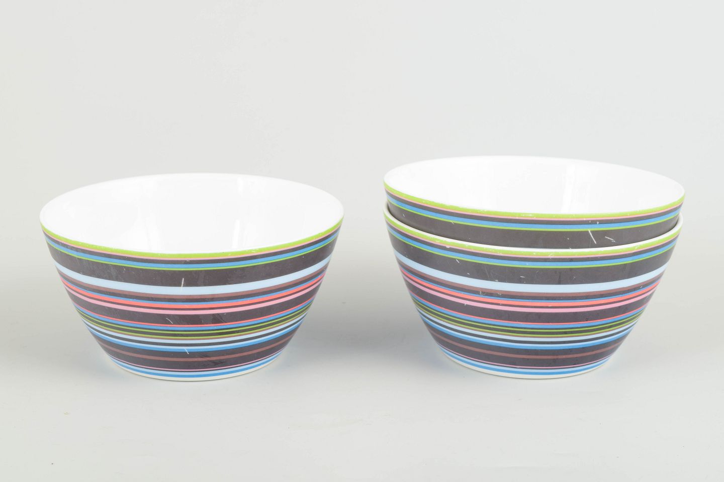 Alfredo Häberli for Iittala, tre skåle “Origo”, 2000’erne.Tre farvestrålende skåle i porcelæn fra den ikoniske Origo-serie, dekoreret med de karakteristiske flerfarvede, horisontale striber.