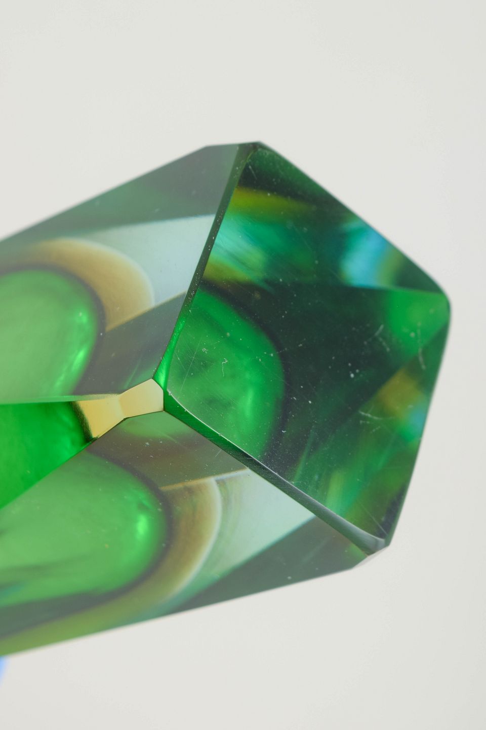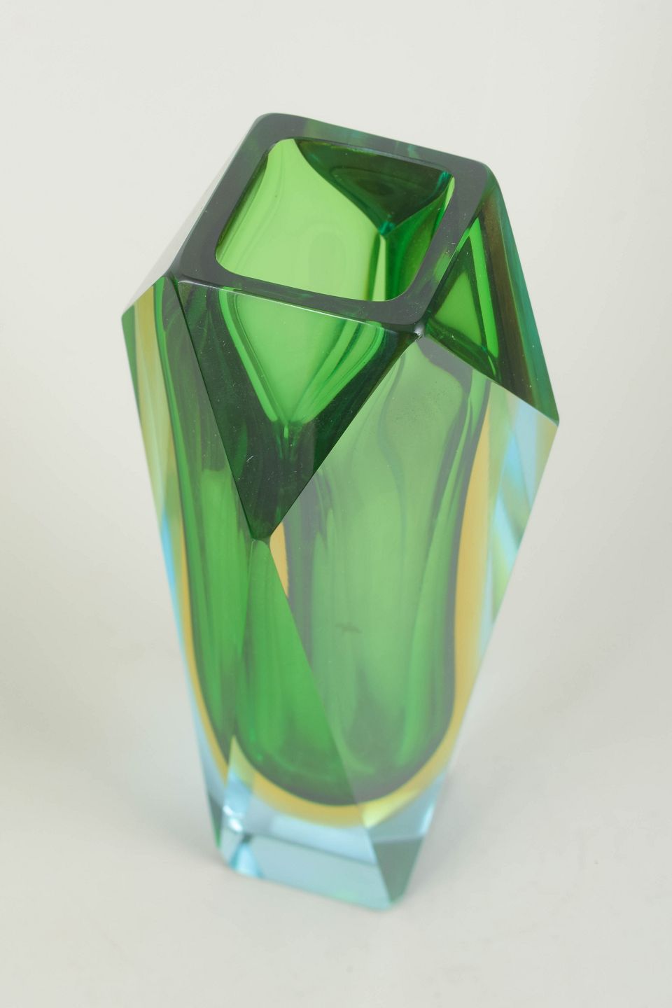 Elegant, geometrisk skåret sommerso-vase i lagdelt Murano-glas med klar/turkis ydre masse og intens grøn indre kerne. De mange slebne flader giver stærke lysbrydninger og et markant skulpturelt udtryk, typisk for Mandruzzatos håndværk i perioden.