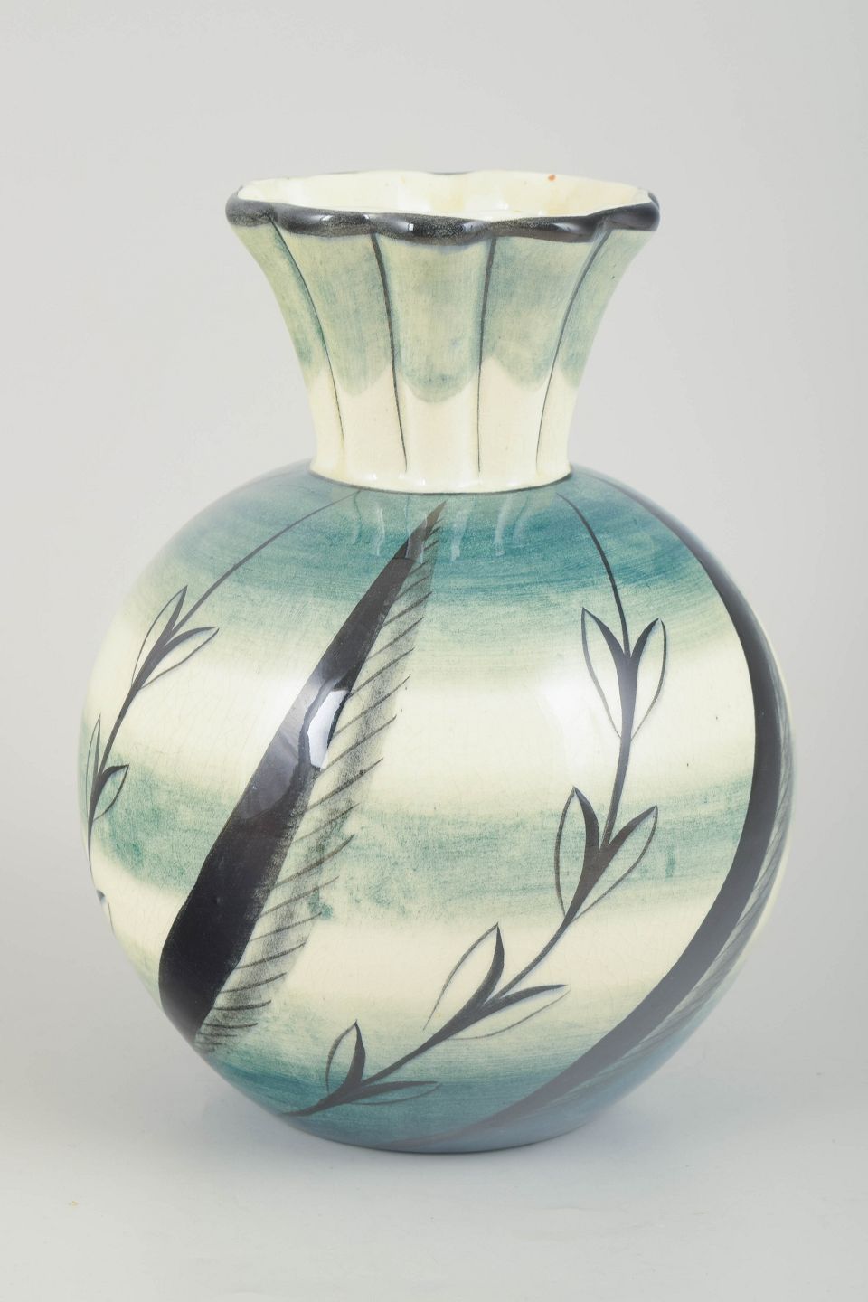 Art Deco-inspireret vase i glaseret fajance med håndmalet dekor i blå, grønne og sorte nuancer. Den svungne krop og riflede, udsvajede hals fremhæver periodens dekorative formsprog.