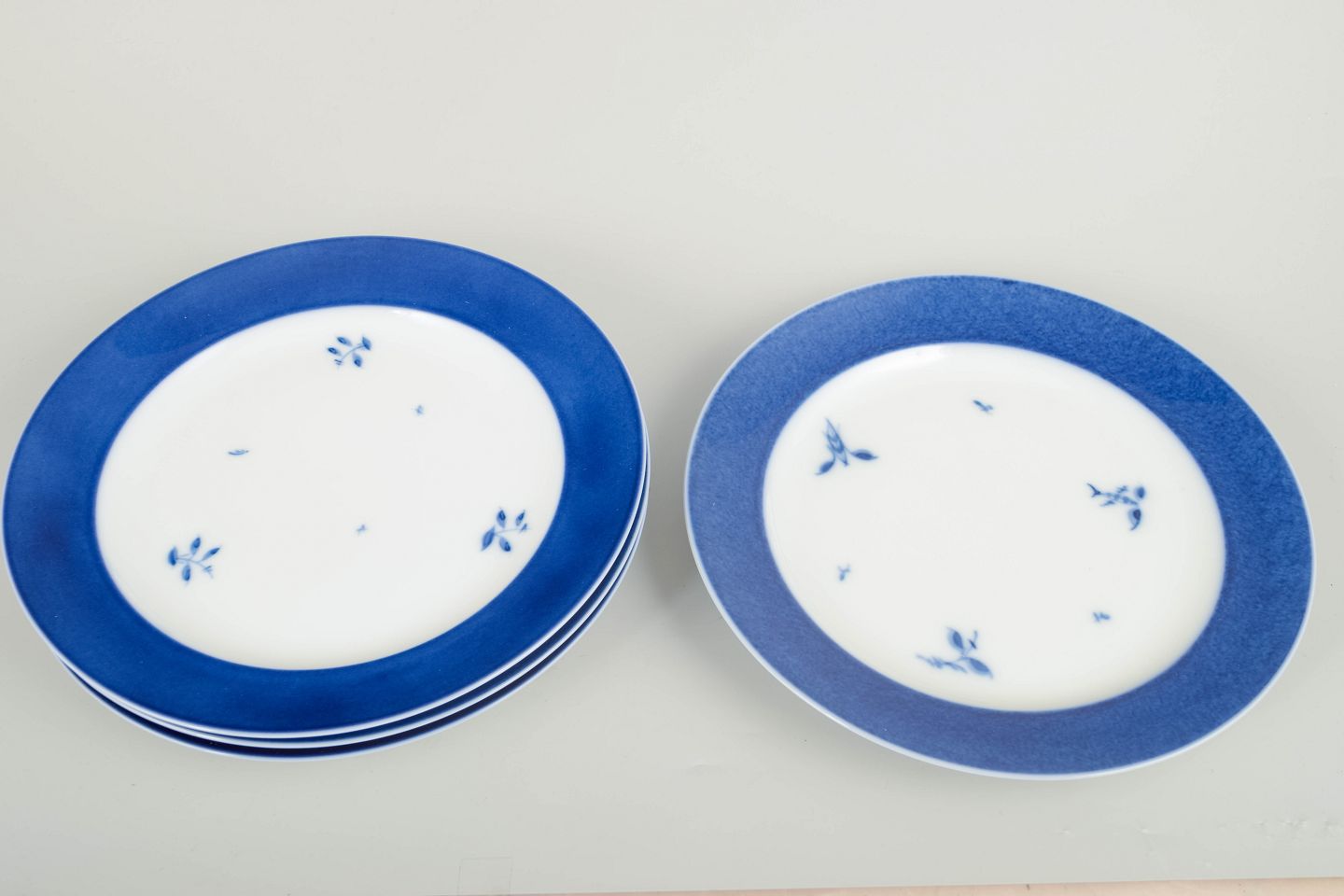 Sjældne, store tallerkener i porcelæn med bred blå kant og fine håndmalede blomsterdekorationer. Klassisk Royal Copenhagen-æstetik i et rent og elegant 60’er-udtryk.