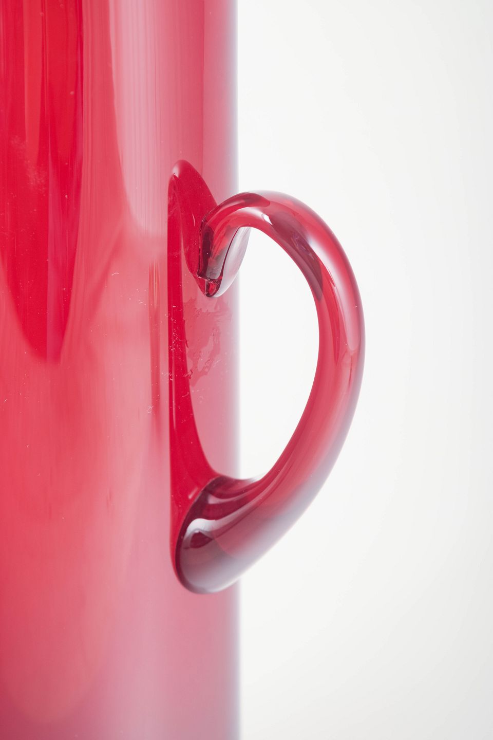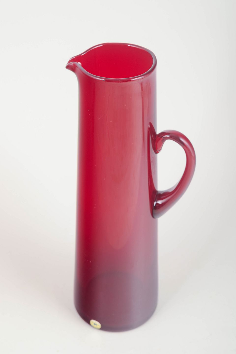 Høj cylindrisk art-glass kande i dyb rubinrød glasmasse med elegant buet hank og lille hældetud. Med originalt Reijmyre-klistermærke.