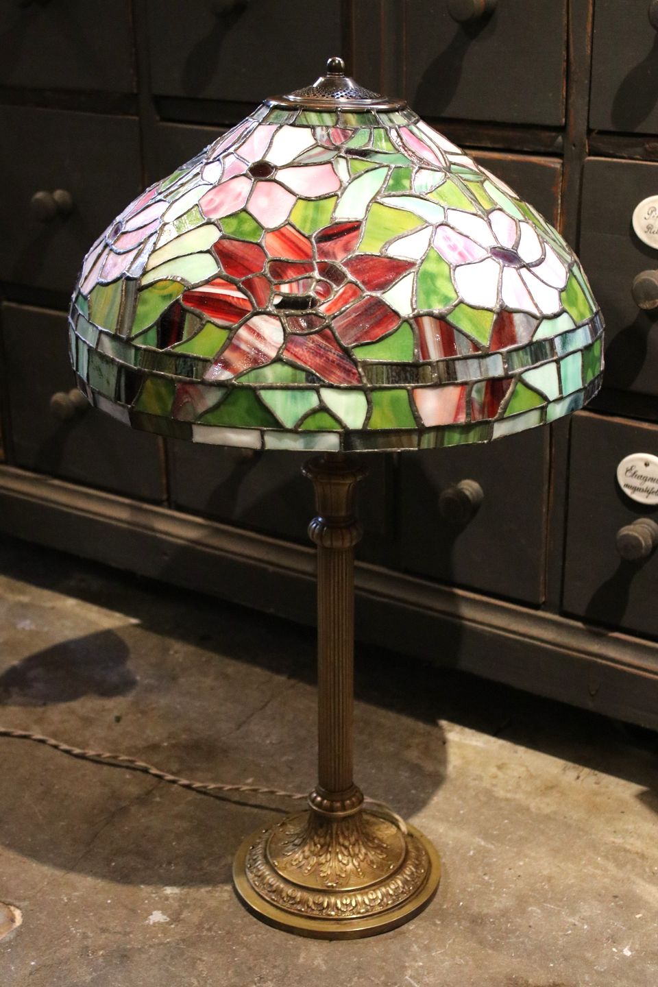 Dekorativ , gammel Tiffany bordlampe fra 40érne. med glasskærm i farvet blomstermotiv og fod i bronze...