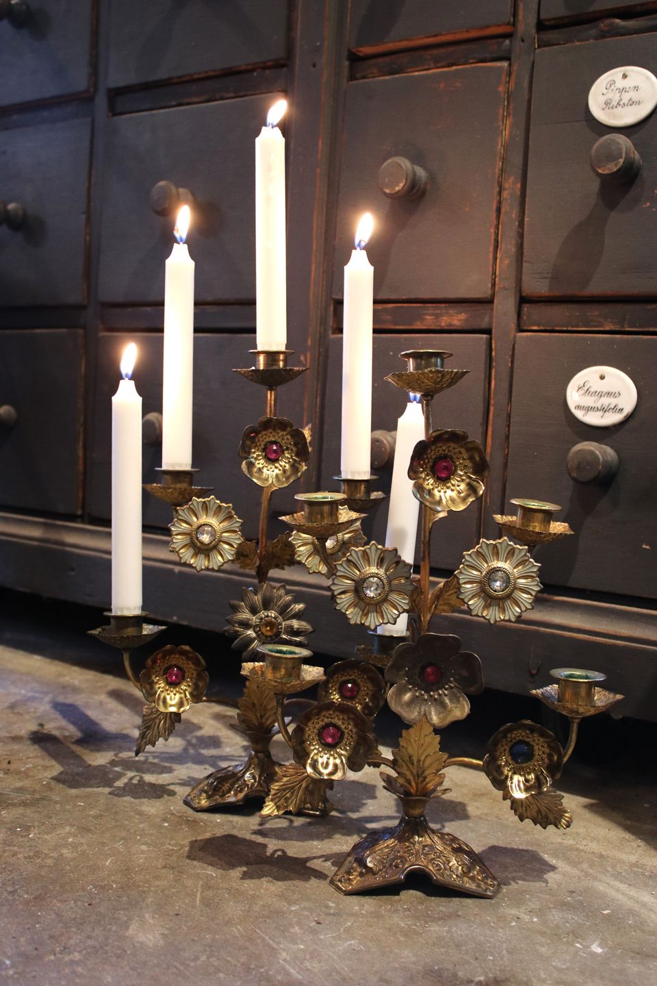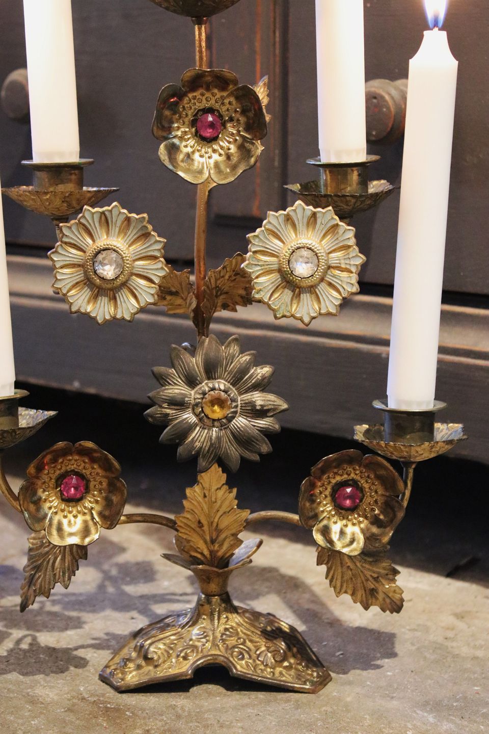Antik , franske kirkelysestage i forgyldt metal dekoreret med 6 metalblomster med farvet sten...