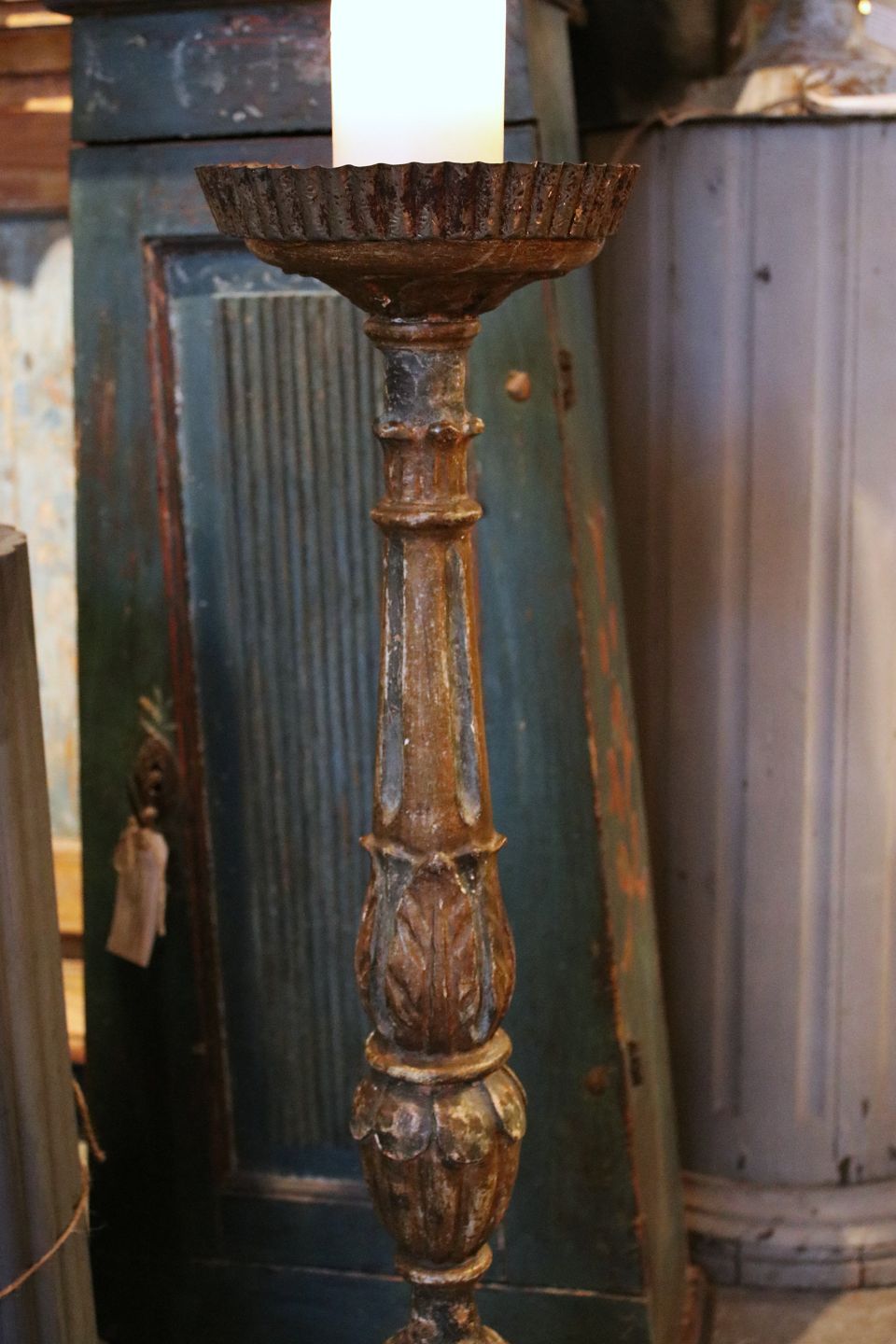Antik , fransk 1800 tals gulv lysestage i udskåret træ med original bemaling og med en rigtig fin patina. Højde: 80cm.