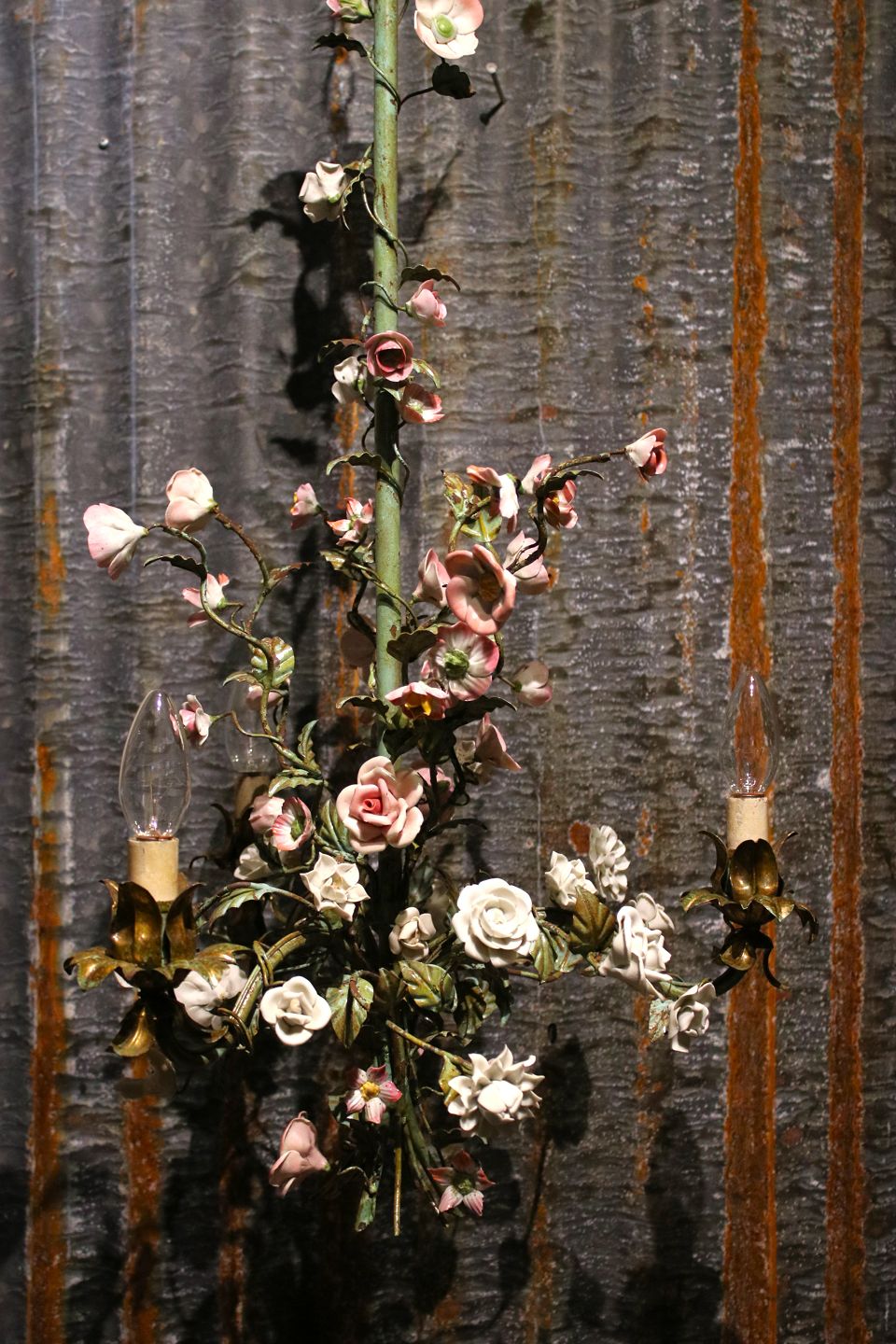 Gammel fransk lysekrone med base i grønmalet metal stel dekoreret med en masse små fine farvet / hvide porcelænsblomster.Lysekronen har 3 lyskilder og måler H: 85cm. Dia.: 45cm.