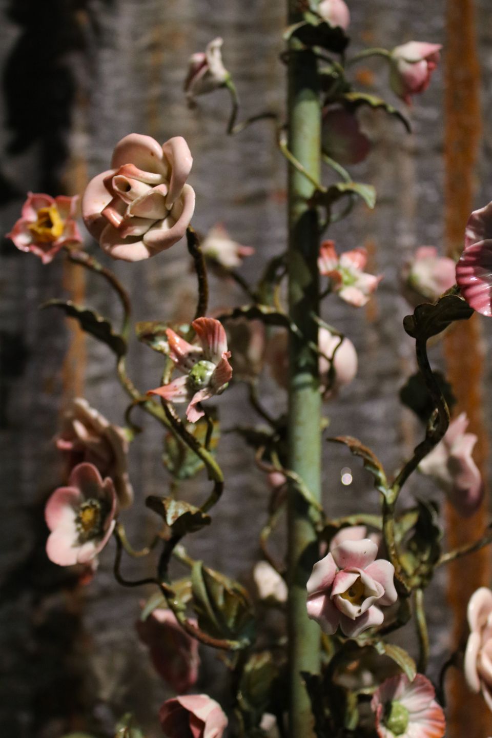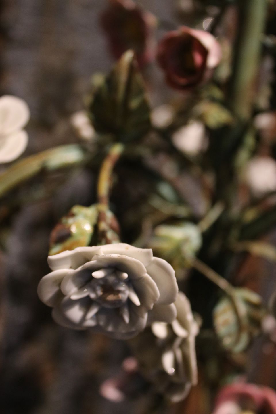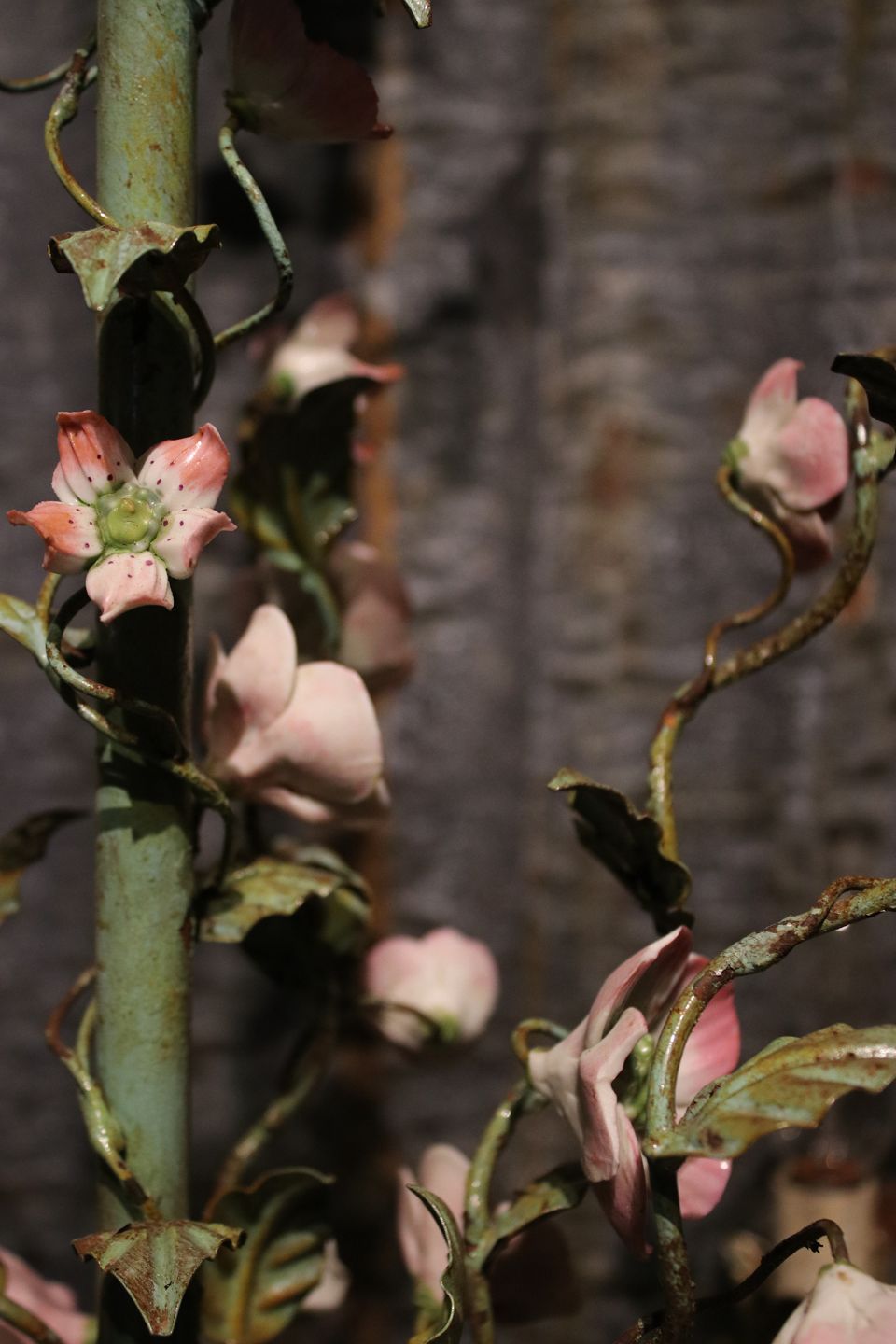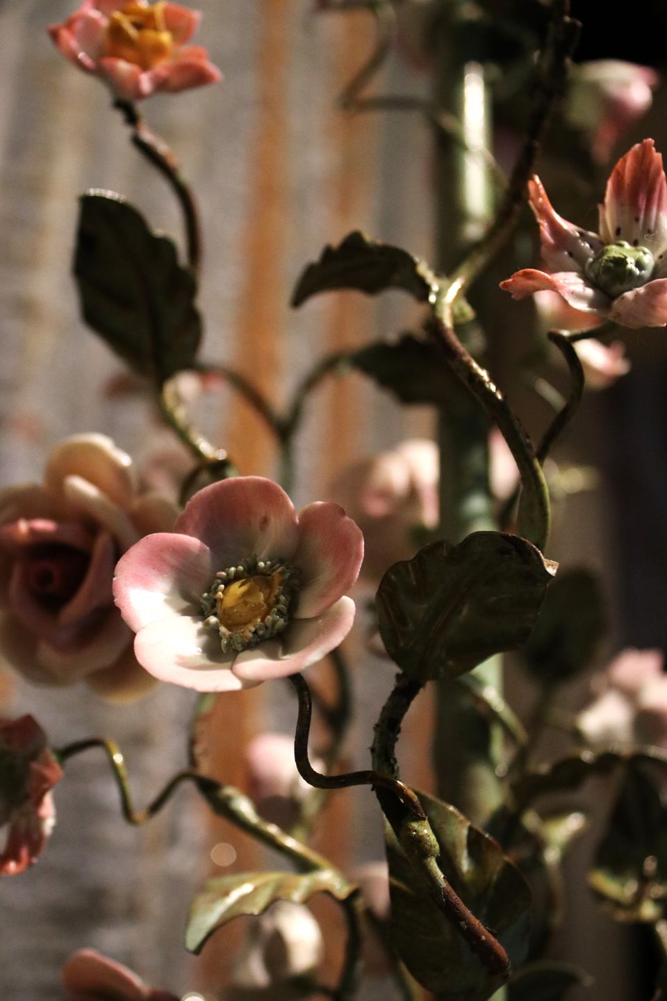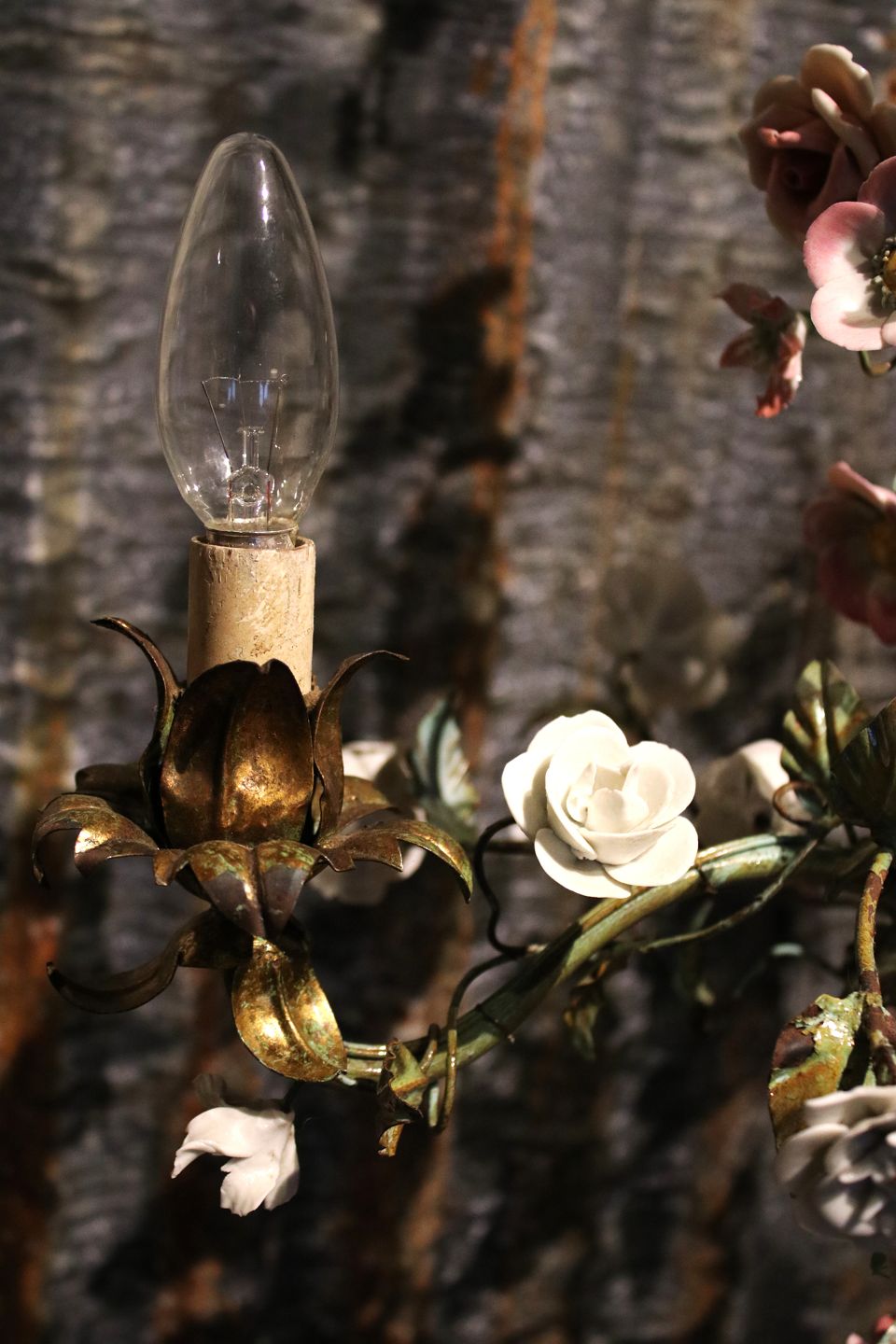 Gammel fransk lysekrone med i grønmalet metal dekoreret med fine farvet/hvide porcelænsblomster.