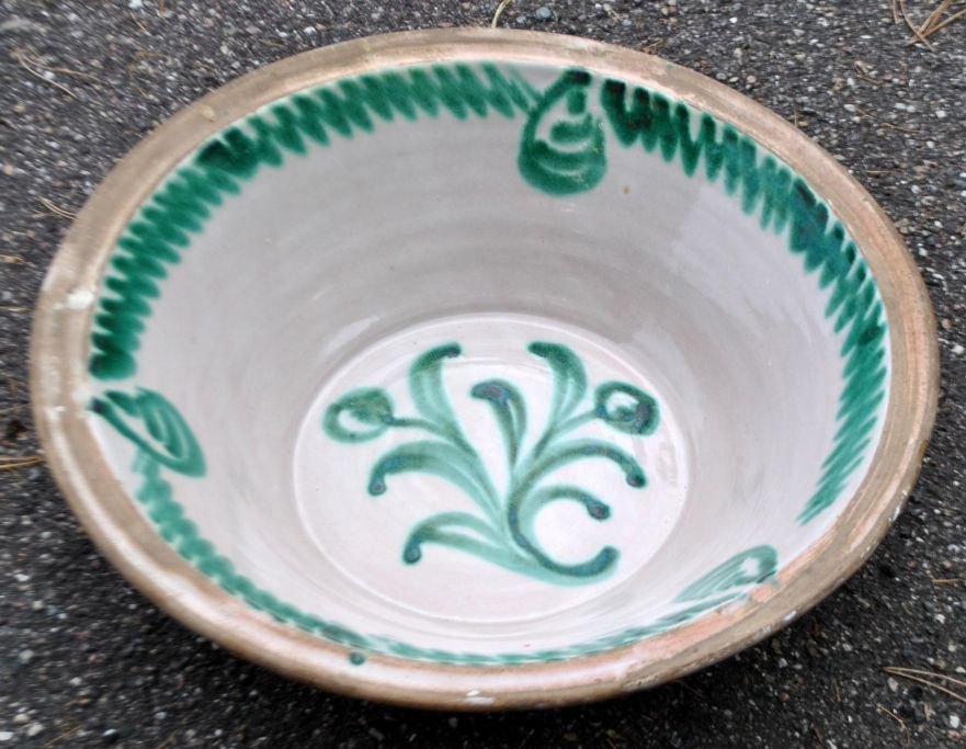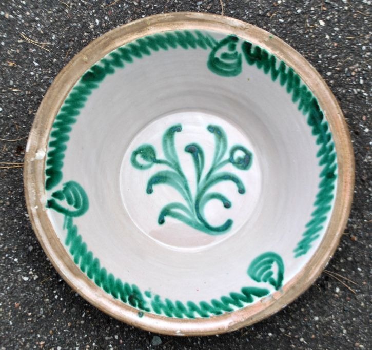 Große antike Tonschale, 19. Jahrhundert. Innen grün und hell glasiert. Mit Rand- und Mitteldekor in Form einer Blume. Durchmesser: 42 cm. Höhe: 12 cm.Einwandfreier Zustand!