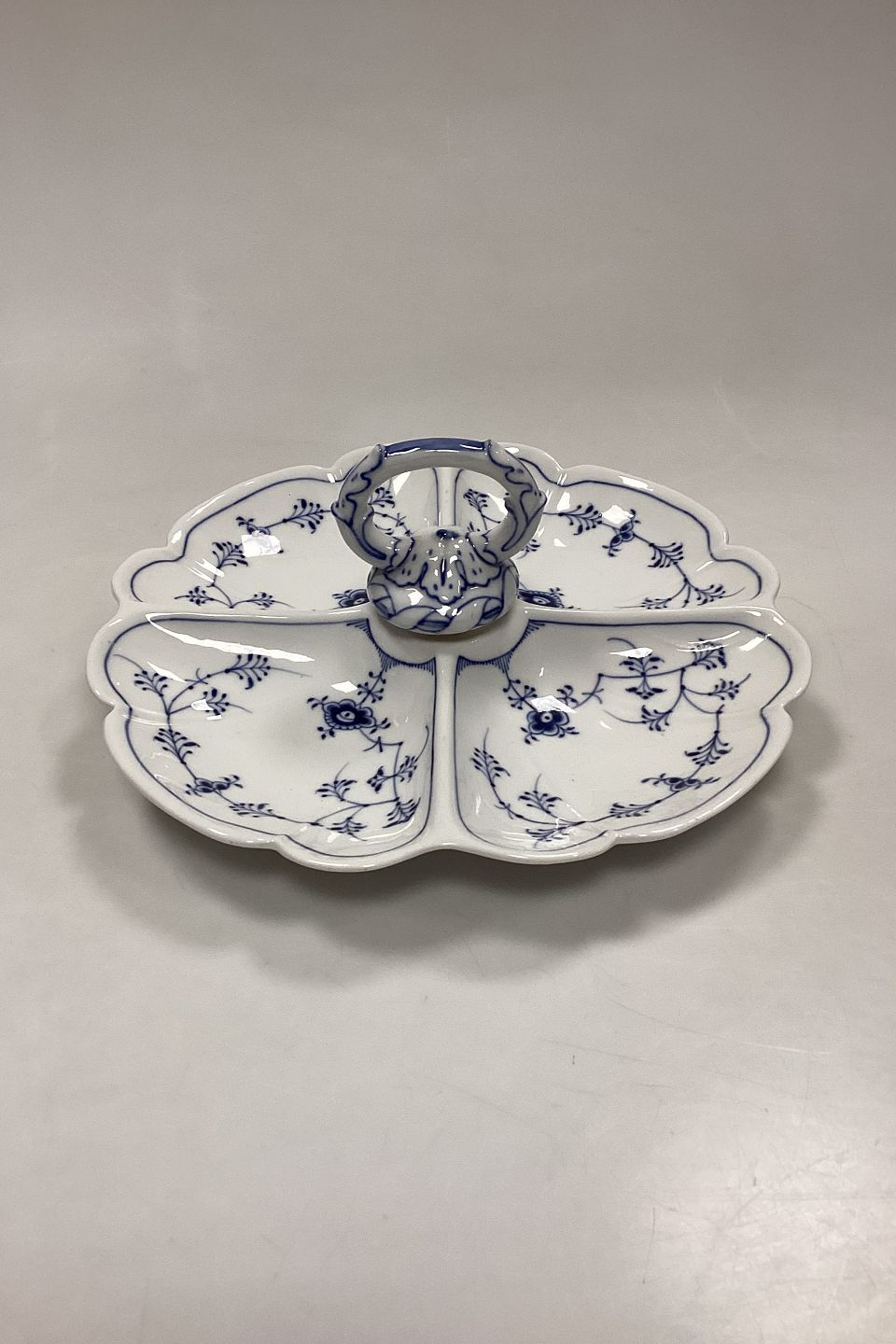Royal Copenhagen Musselmalet Riflet Kabaretfad No. 396. Fire ruminddelinger og hank. 1. Sortering. Måler 28,5 cm / 11,22 in. i dia.x 9 cm / 3,54 in. i højden med hank.