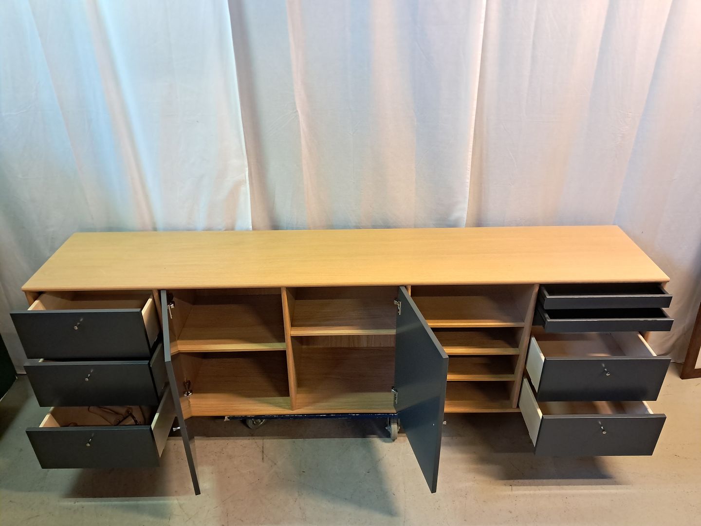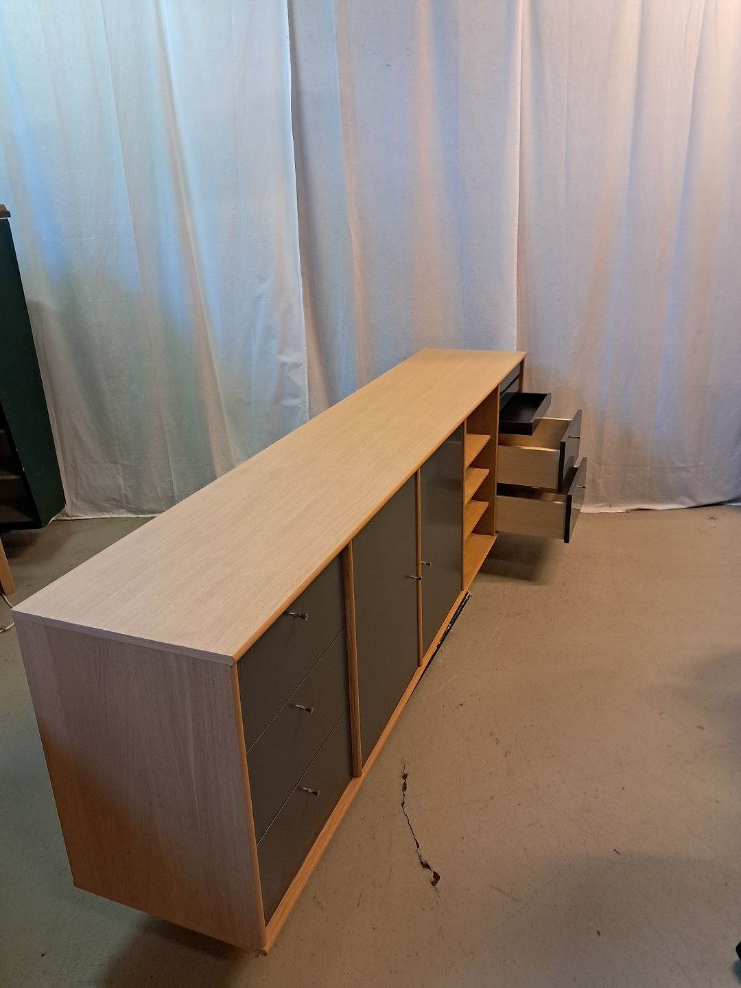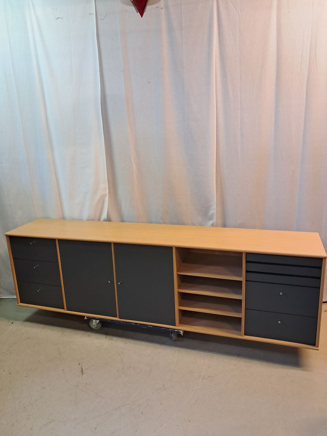 Skænk i fineret egetræ, fra 2010erne.Den kan vægmonteres, der medfølger vægophæng og der medfølger også 6 ben.