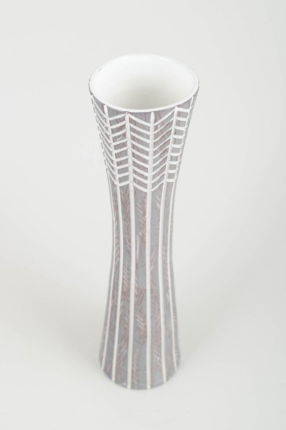 Høj, slank keramikvase i glaseret fajance med karakteristisk geometrisk dekoration i grå og hvide toner, typisk for Simmulsons stilrene og moderne udtryk.