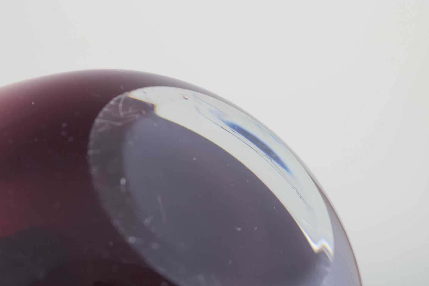 Organisk formet skål i mundblæst glas med lagdelt farvespil i dybe rubin- og klare toner, typisk for Murano-glas fra perioden.