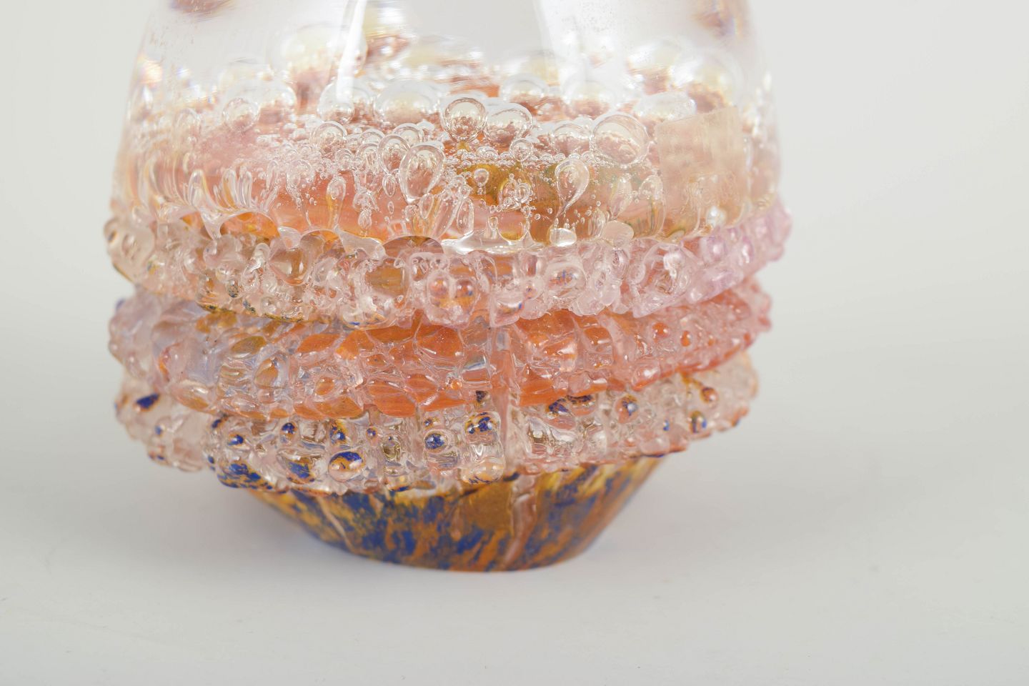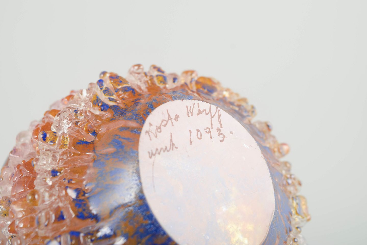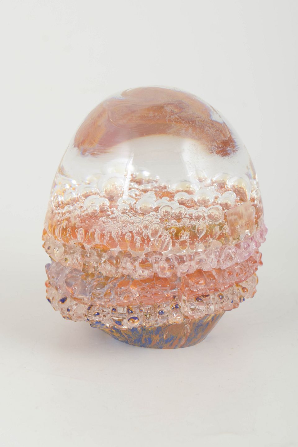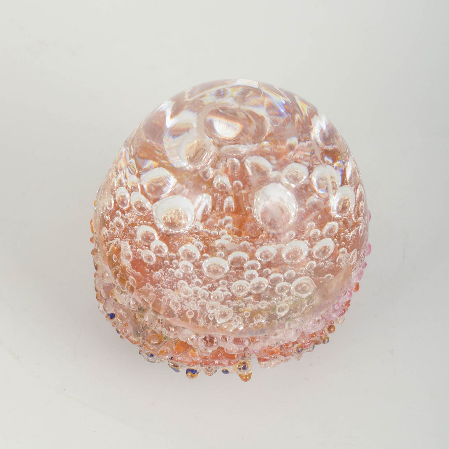 Göran Wärff for Kosta Boda, brevvægt, unika, model 1093.Organisk formet kunstglas-objekt med indkapslede luftbobler og lagdelte farvetoner i rosa, rav og klare nuancer.