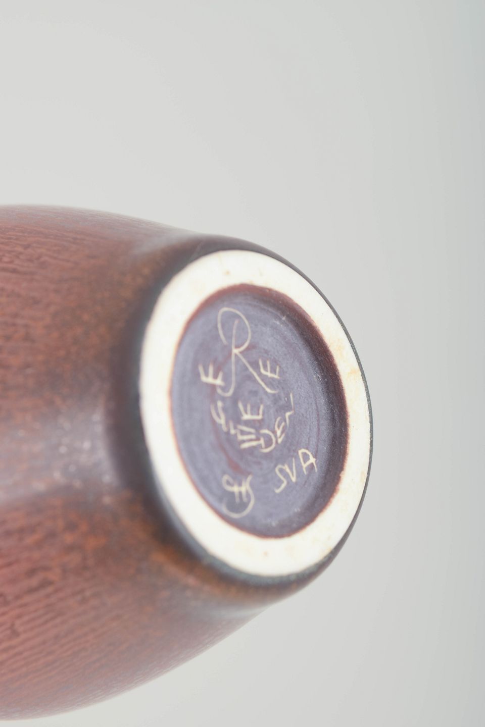 Lille, elegant vase i stentøj med rundet korpus og slank cylindrisk hals, dekoreret med en varm rødbrun glasur med nuanceret, let tekstureret overflade – et fint eksempel på Stålhanes formsikkerhed og subtile glasurarbejde.