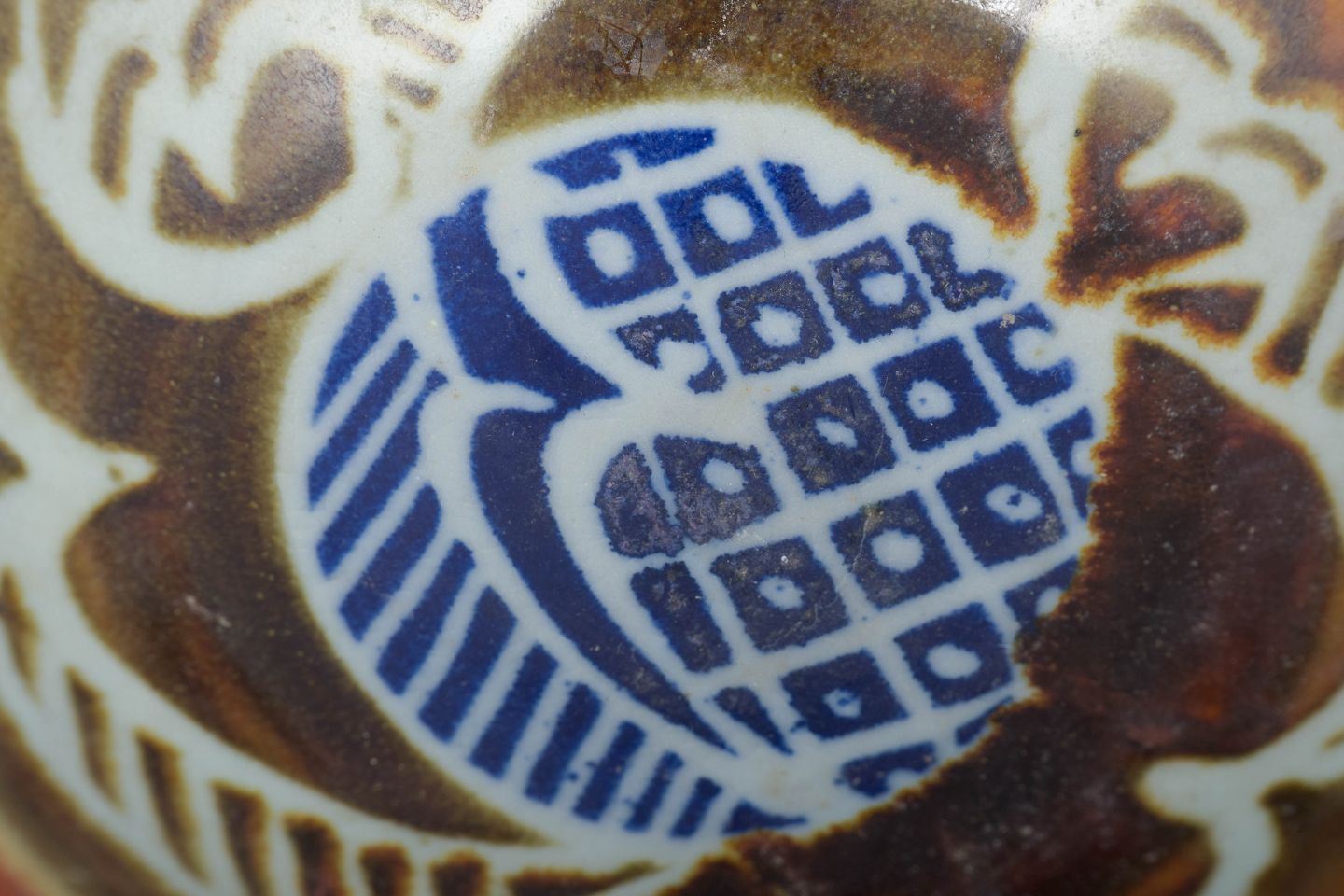 Unik skål i kinesisk-inspireret stil med dekorativ relief- og penselmalet dekoration samt lys celadonlignende glasur og rødlig kant. Signeret.