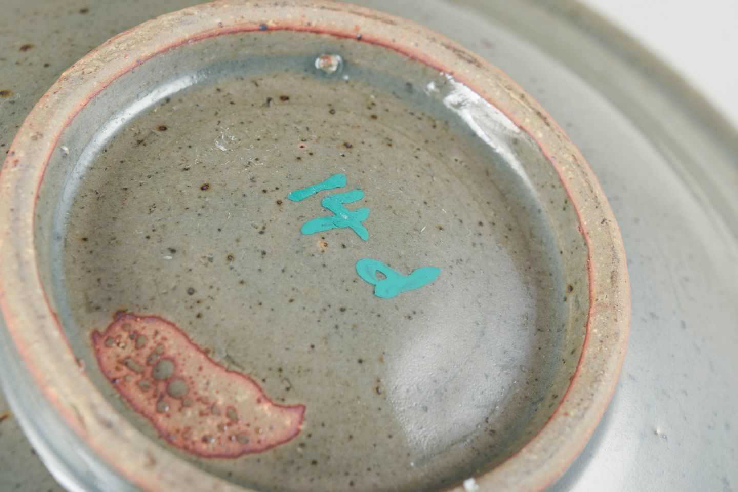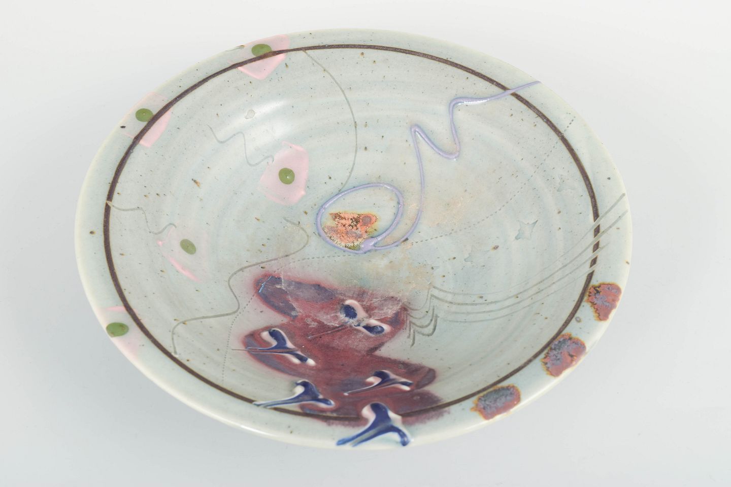 Unik skål i kinesisk-inspireret stil med dekorativ pensel- og reliefdekoration samt lys celadonlignende glasur med farvede detaljer. Signeret.