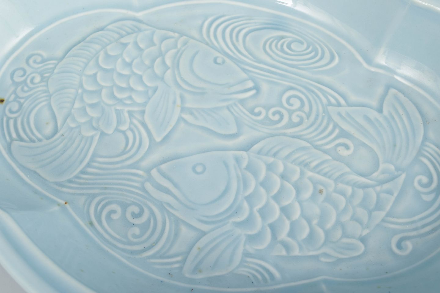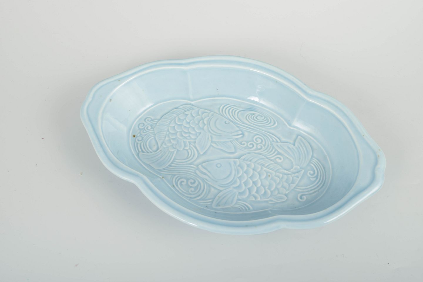 Unikt fad i kinesisk-inspireret stil med formpresset dekoration af fisk og lyseblå celadonlignende glasur. Signeret.