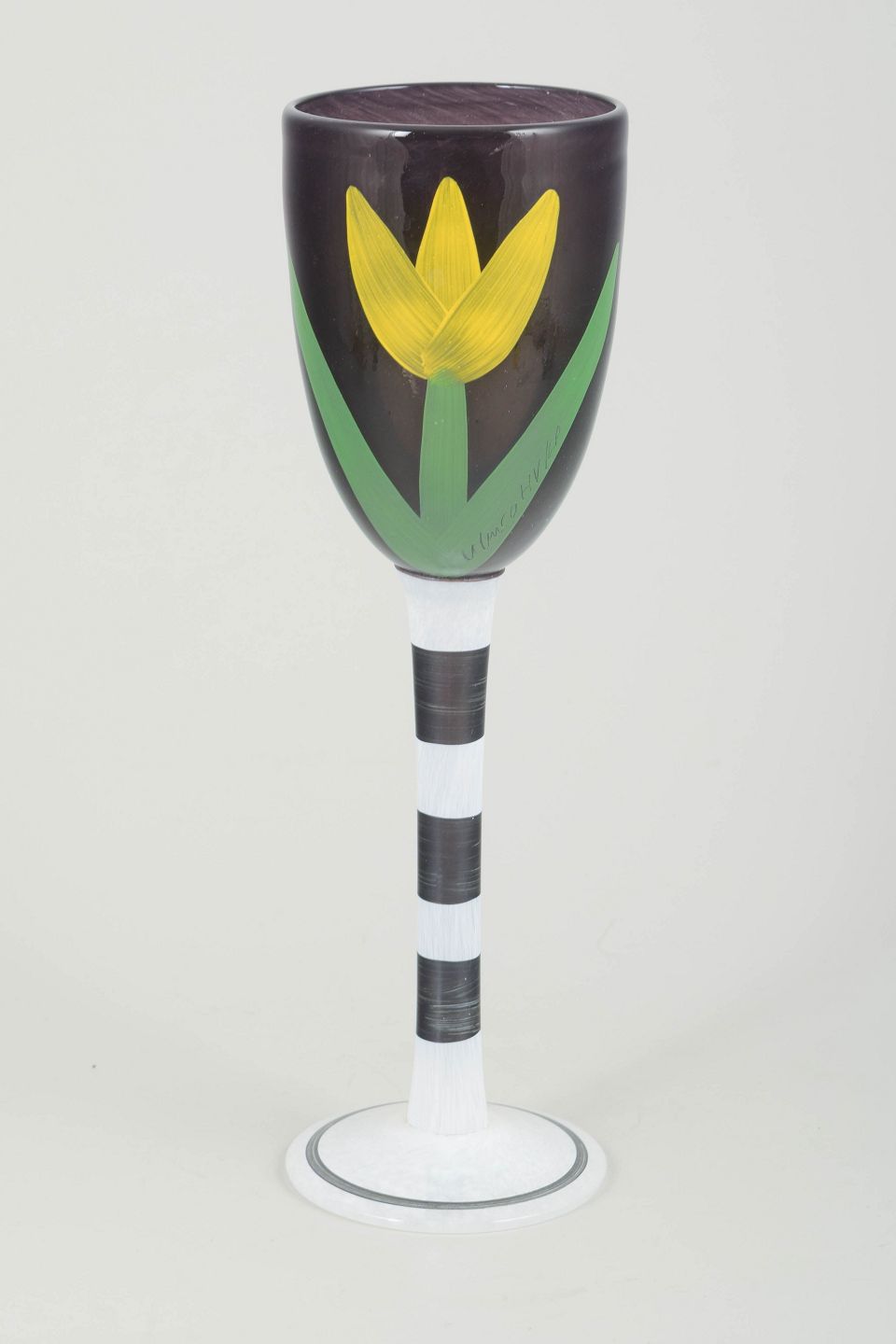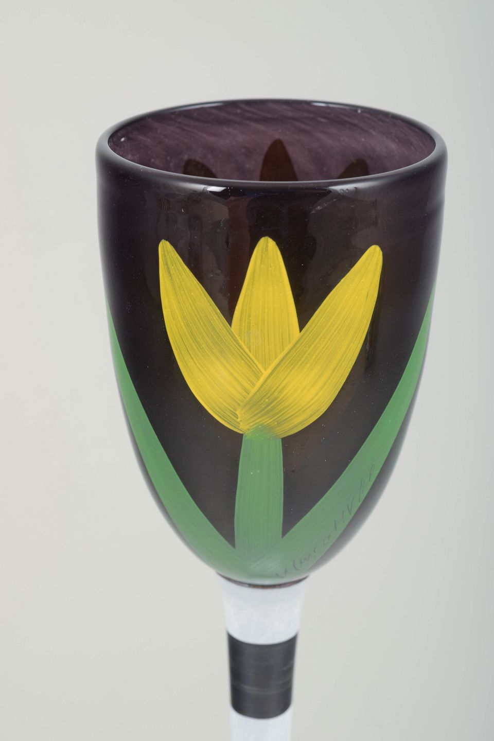 Højt dekorativt kunstglas med håndmalet blomstermotiv i gule og grønne toner på mørk baggrund, samt karakteristisk stribet stilk i sort og hvid. Signeret.