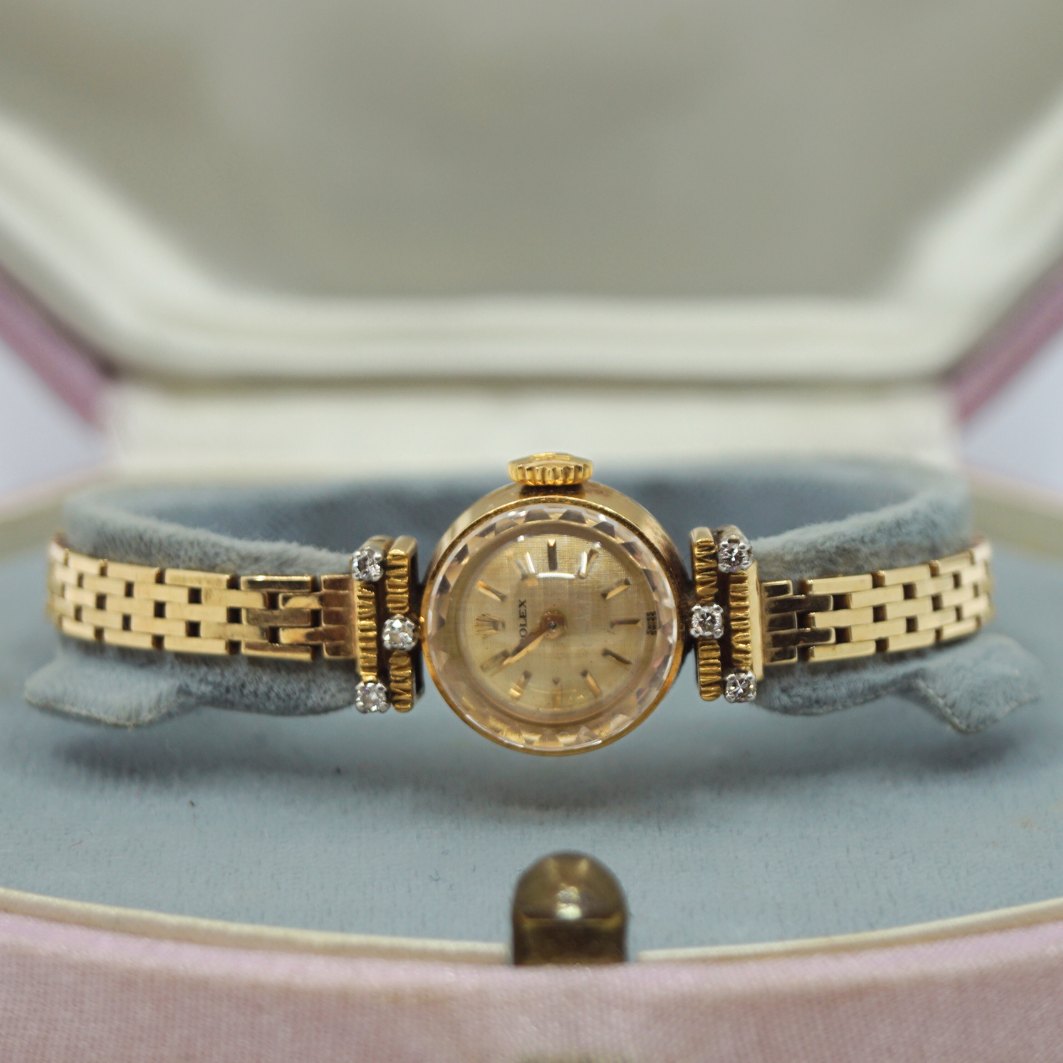 Rolex armbåndsur.Rolex; Orchid dameur af 18 kt. guld, prydet med seks diamanter sat i hvidguld. Ref. 988531. Lænke i 14 kt. guld i murstenmønster. Kasselås med 2 sikkerhedslåse.