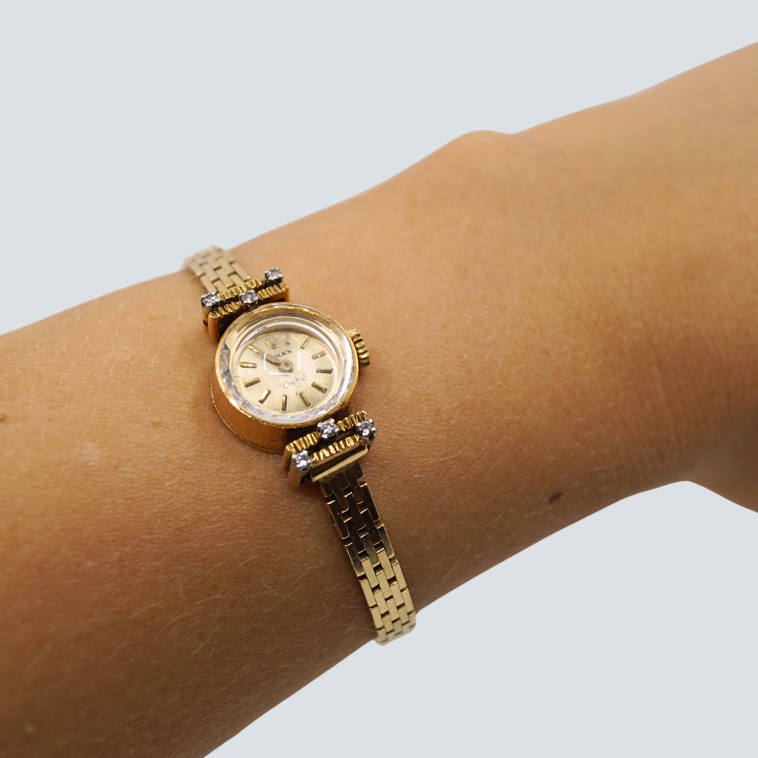 Rolex; Orchid dameur af 18 kt. guld med diamanter, med lænke i 14 kt. guld