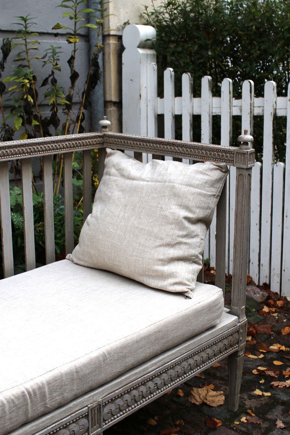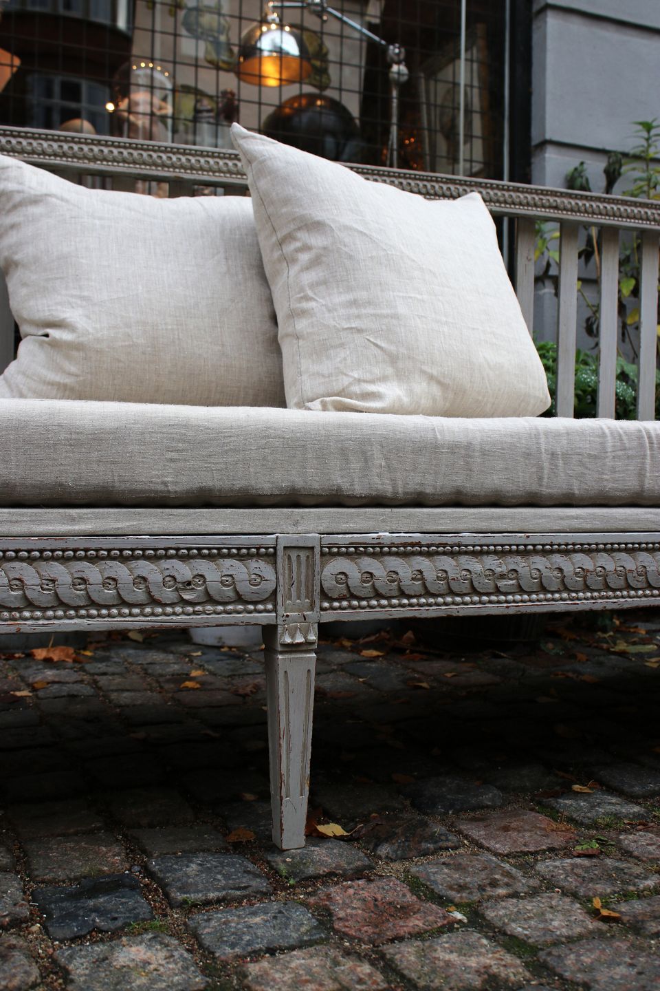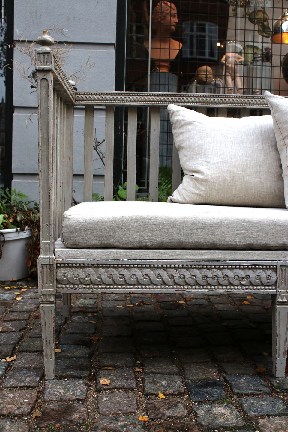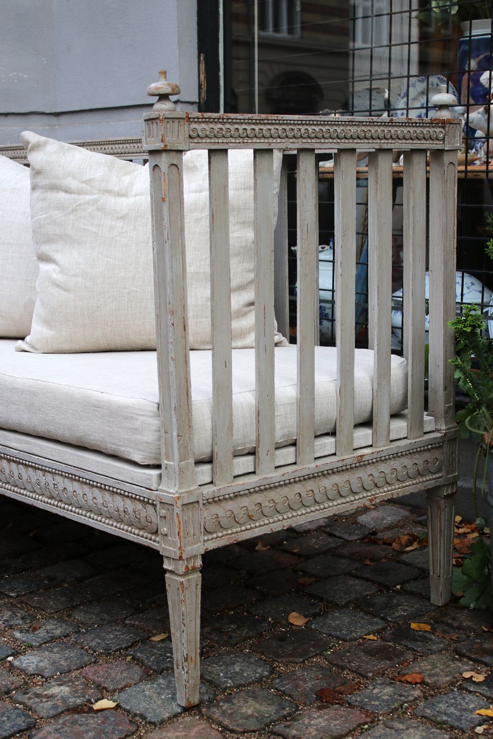 Gustaviansk svensk 1800 tals sofabænk i original grå farve med fin patina. Sofaen har siddehynde i hørstof og 3 hørpuder.