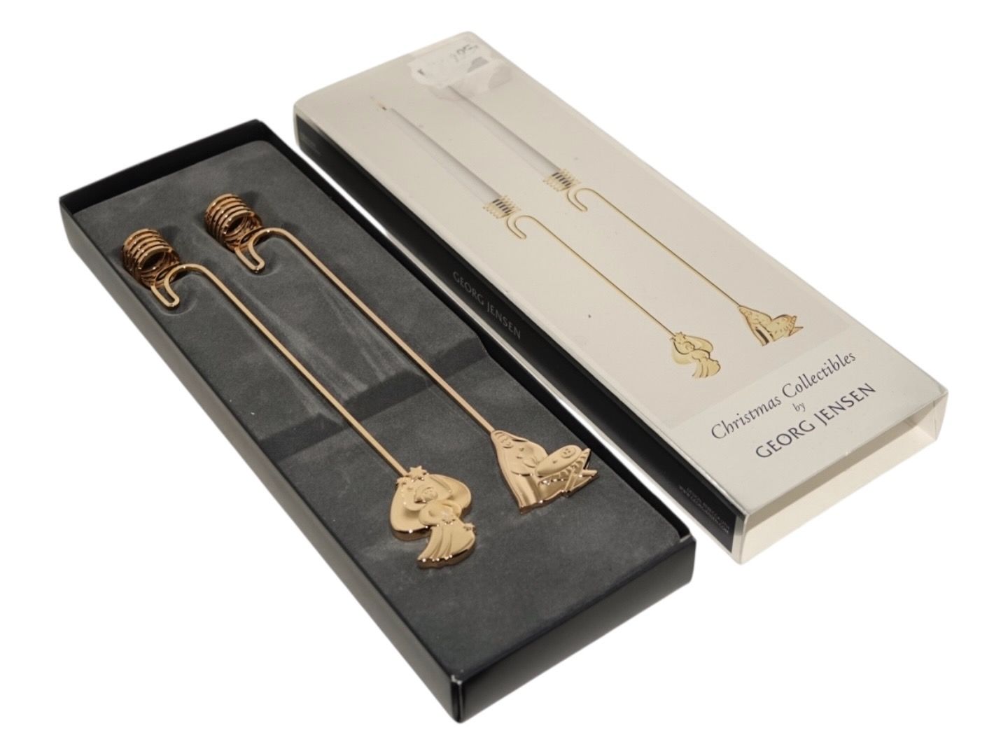 Georg Jensen Golden Christmas, pakke med to lysholdere med Engel og Jomfru Maria & Jesus fra 2012.Måler 15 cm.