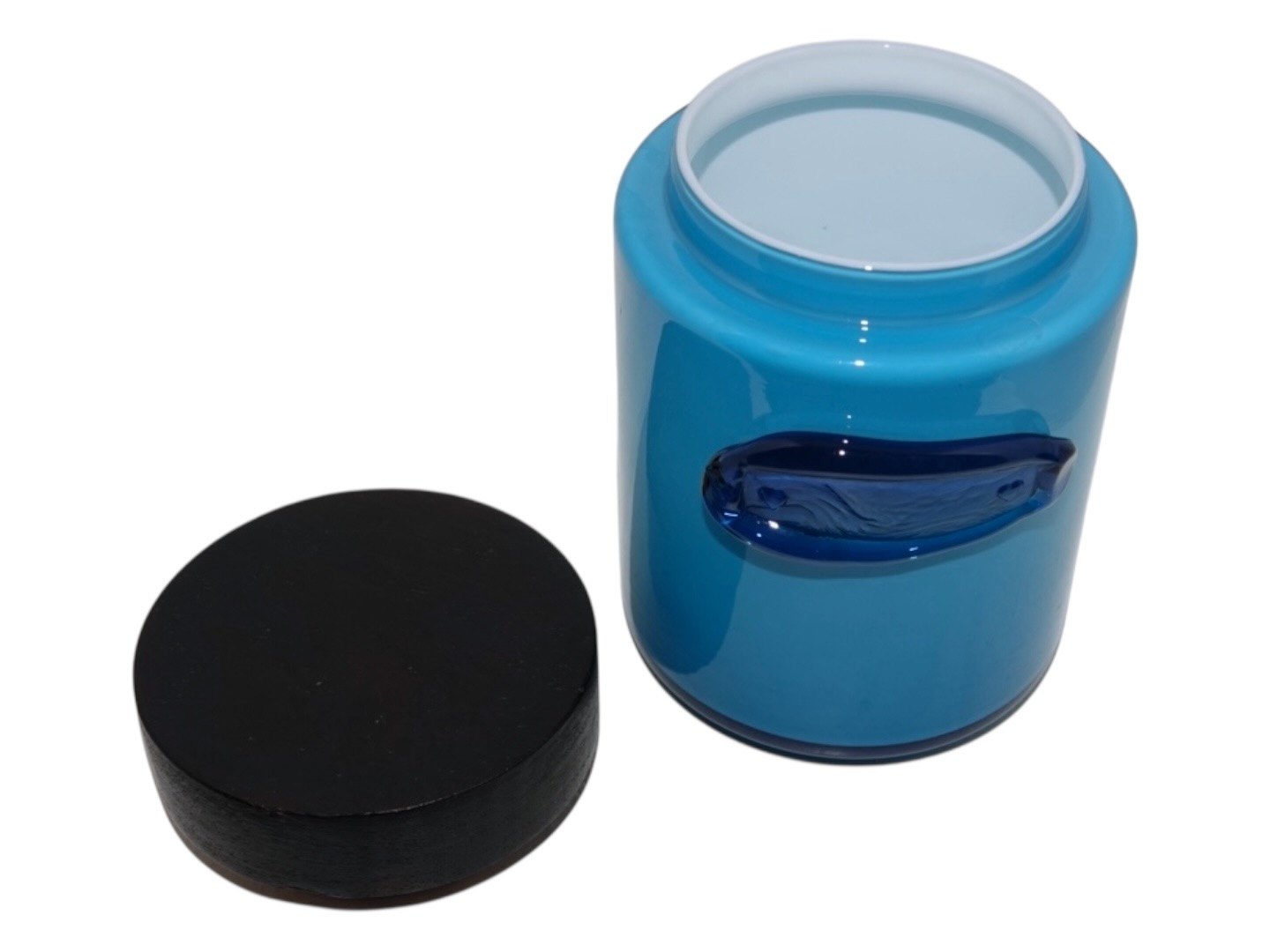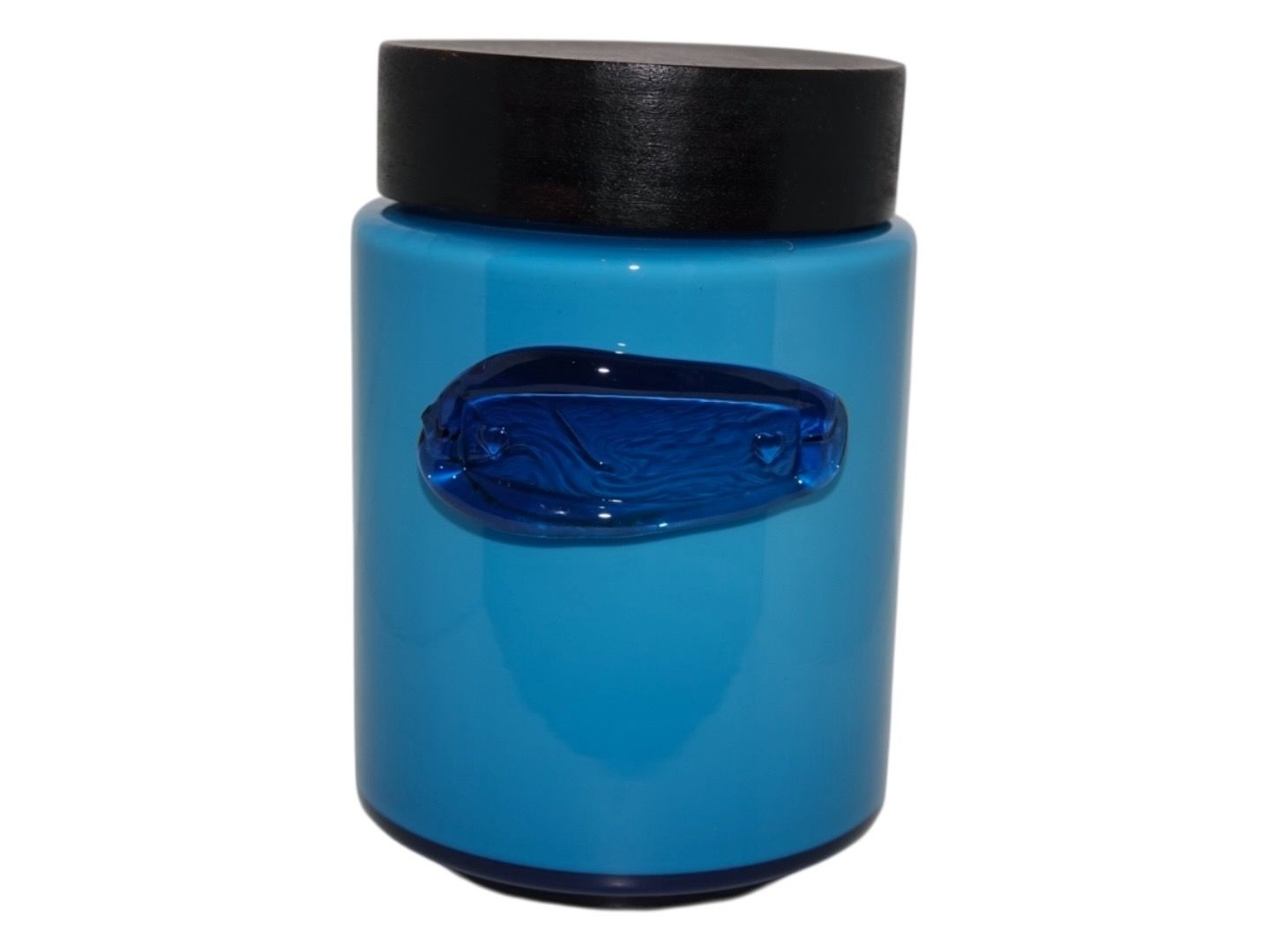 Holmegaard Palet, blå opbevaringskrukke med trælåg uden tekst.Designet af Michael Bang i 1970.