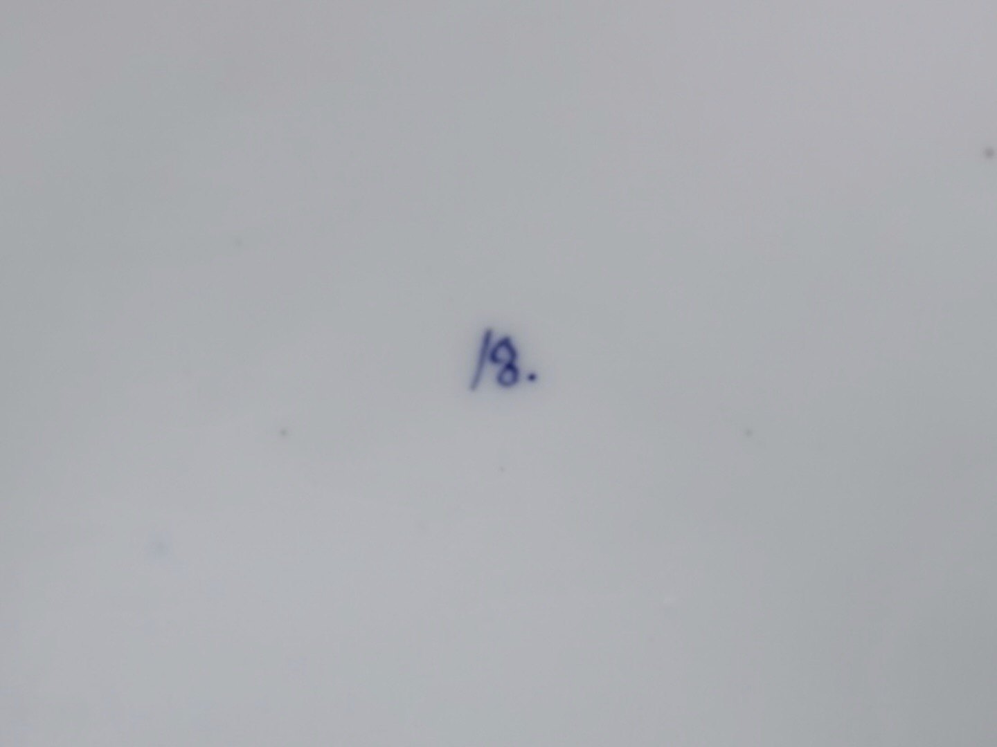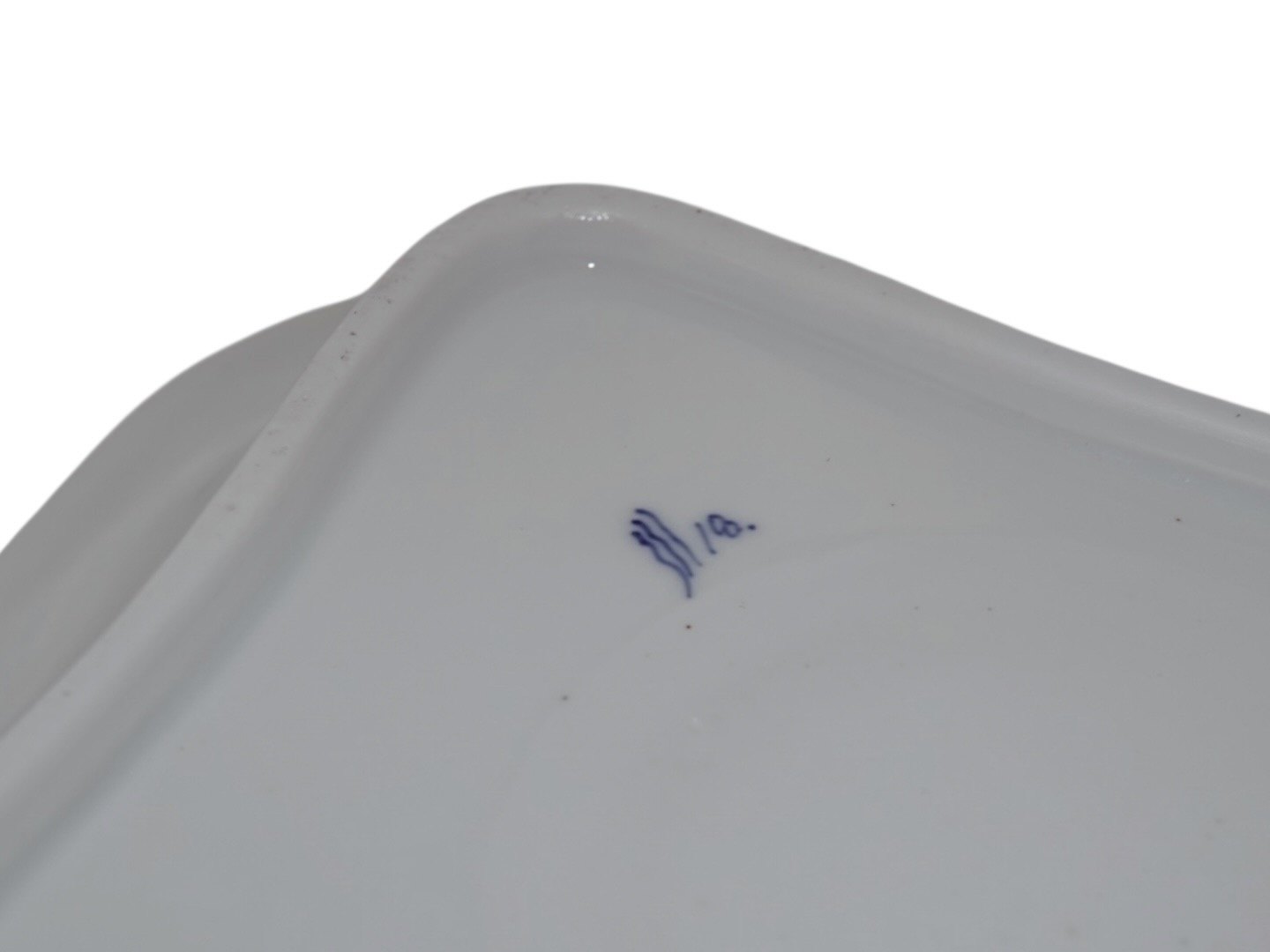 Royal Copenhagen Blå Blomst, sjældent firkantet lågfad.Af fabriksmærket og malermærke 18 kan det udledes, at denne er malet af Frøken A. Hansen, som var ansat hos Royal Copenhagen mellem juni 1875 til marts 1891.