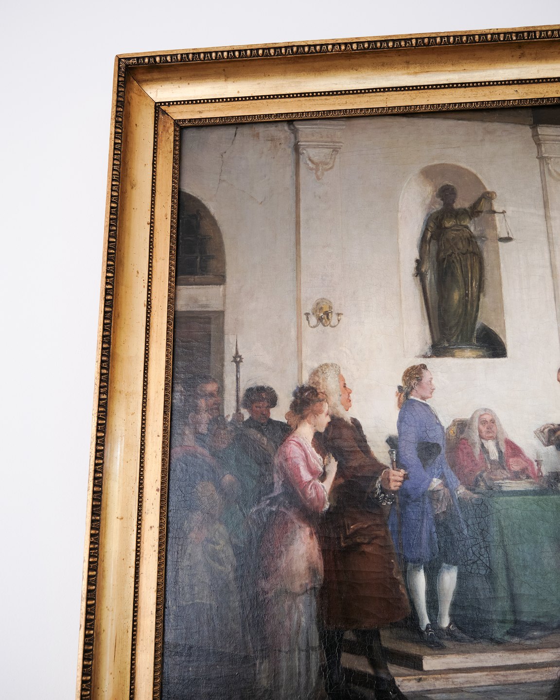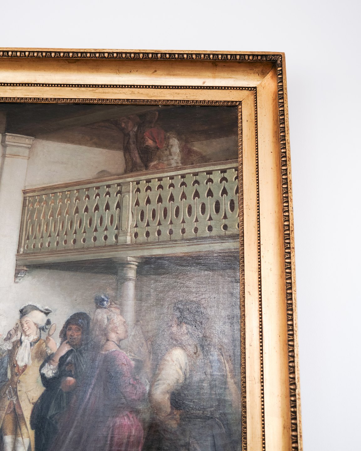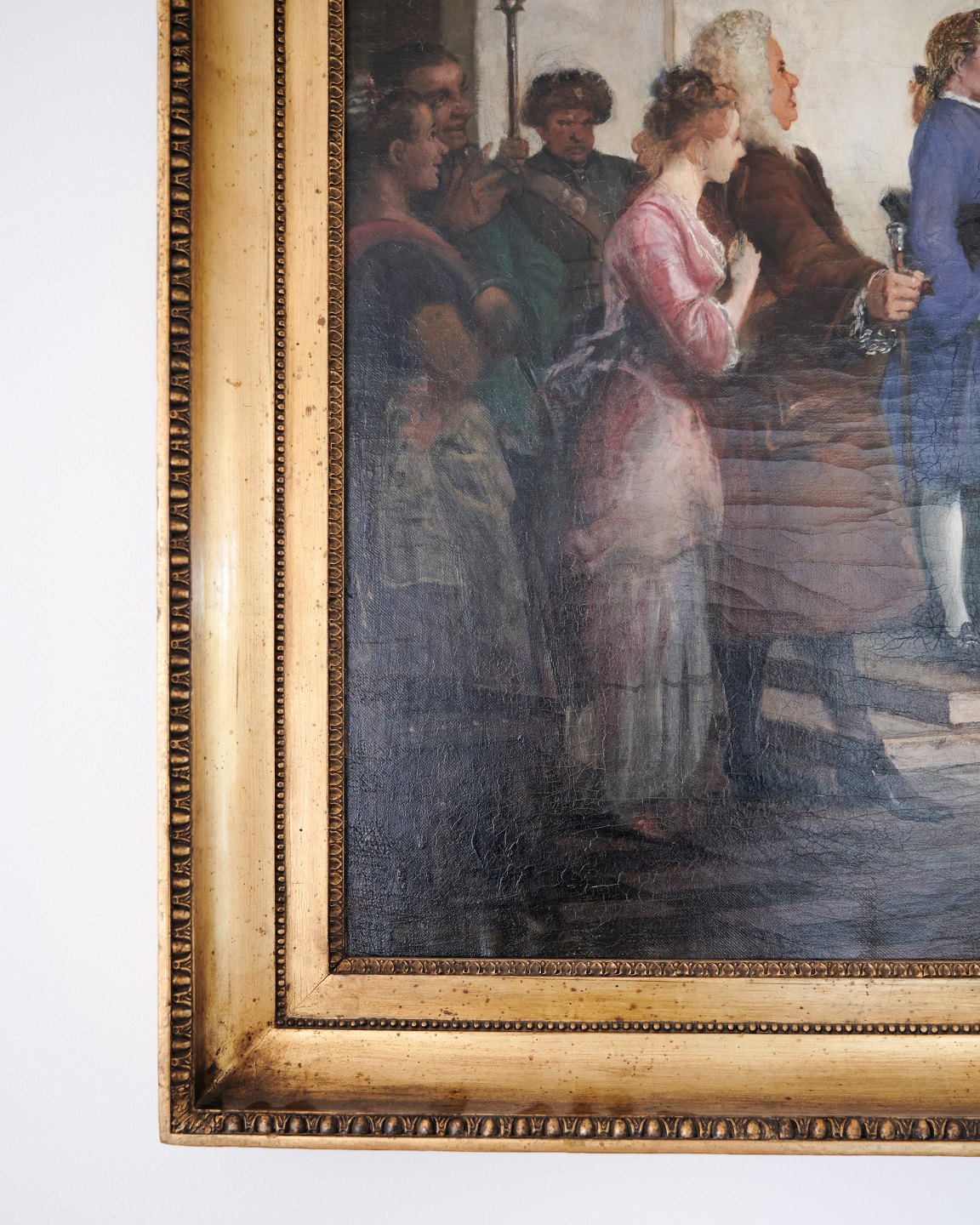 Ölgemälde auf Leinwand, Wilhelm Marstrand (1810–1873) zugeschrieben, dargestellt ist die abschließende Szene aus Ludvig Holbergs Komödie „Das Glückliche Schiffbruch“. Das Gemälde ist unsigniert und misst 95 x 135 cm. Die Ny Carlsberg Glyptotek besitzt eine weitere Version des Motivs (90 x 127 cm), bei der sowohl der Innenraum als auch die dargestellten Personen vom vorliegenden Bild abweichen. Nivaagaard besitzt zudem eine Skizze der Szene, die sowohl Übereinstimmungen als auch Unterschiede zu den beiden Gemälden aufweist.Karl Madsen (1905) beschreibt, dass Marstrand die Komposition mit großer Sorgfalt entwickelte, was durch zahlreiche Studien und Zeichnungen belegt wird. Besonders erwähnt er die Platzierung der markanten Personen – darunter der gesprächige Offizier mit Federhut und die stolze Adlige, die im Bild hervorgehoben erscheinen.