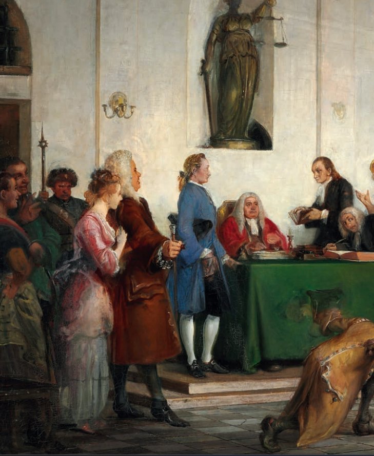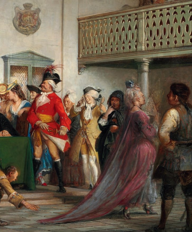 Die Szene zeigt das Ende des Stücks, in dem Rosiflengius sein Urteil erhält. Er wird dazu verurteilt, den sogenannten „spanischen Mantel“ zu tragen – ein Fass mit einer Öffnung für den Kopf, das als Strafe über Personen gestülpt wurde, die öffentlichen Unfrieden verursachten. Sie wurden anschließend durch die Stadt geführt und dem Spott der Bevölkerung ausgesetzt. In Holbergs Komödie wird Rosiflengius für seine übertriebene und unkritische Lobhudelei bestraft; sein Name bedeutet wörtlich „Lob-aufs-Geratewohl“.