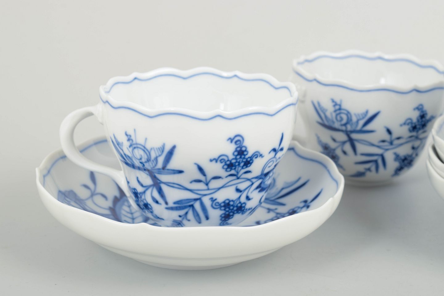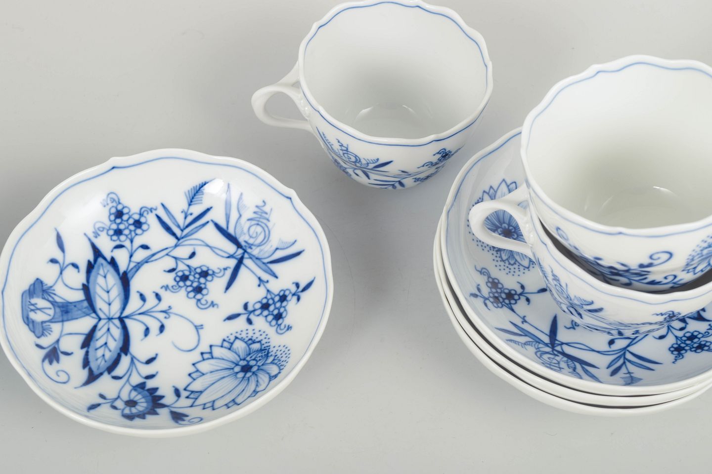 Meissen løgmønstret fire kaffekopper med tilhørende underkopper.